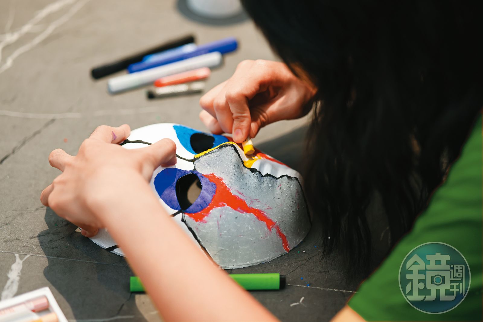 至於小云,由於她希望不露面受訪,二訪時,我們請她繪製一張代表自己的面具進行拍攝。她細心均勻塗畫白色面具,隨著面具漸漸完成,我們不再有一搭沒一搭地說話,僅剩蠟筆刮出規律沙沙沙的聲音。「是不是有點Creepy(詭異)?」她拿著成品,上頭的黑色粗線條將臉分割成數塊,眼睛是飽和的藍色,流出血紅色的眼淚,原本應該是嘴巴的部位,是條蜿蜒的荊棘,「我想的就是,沒有嘴巴,只有一條裂開這樣。」她有些虛弱地說:「畫畫應該有釋放一些東西出來,滿強大的,我也有嚇到了,可以這樣表達感受。」