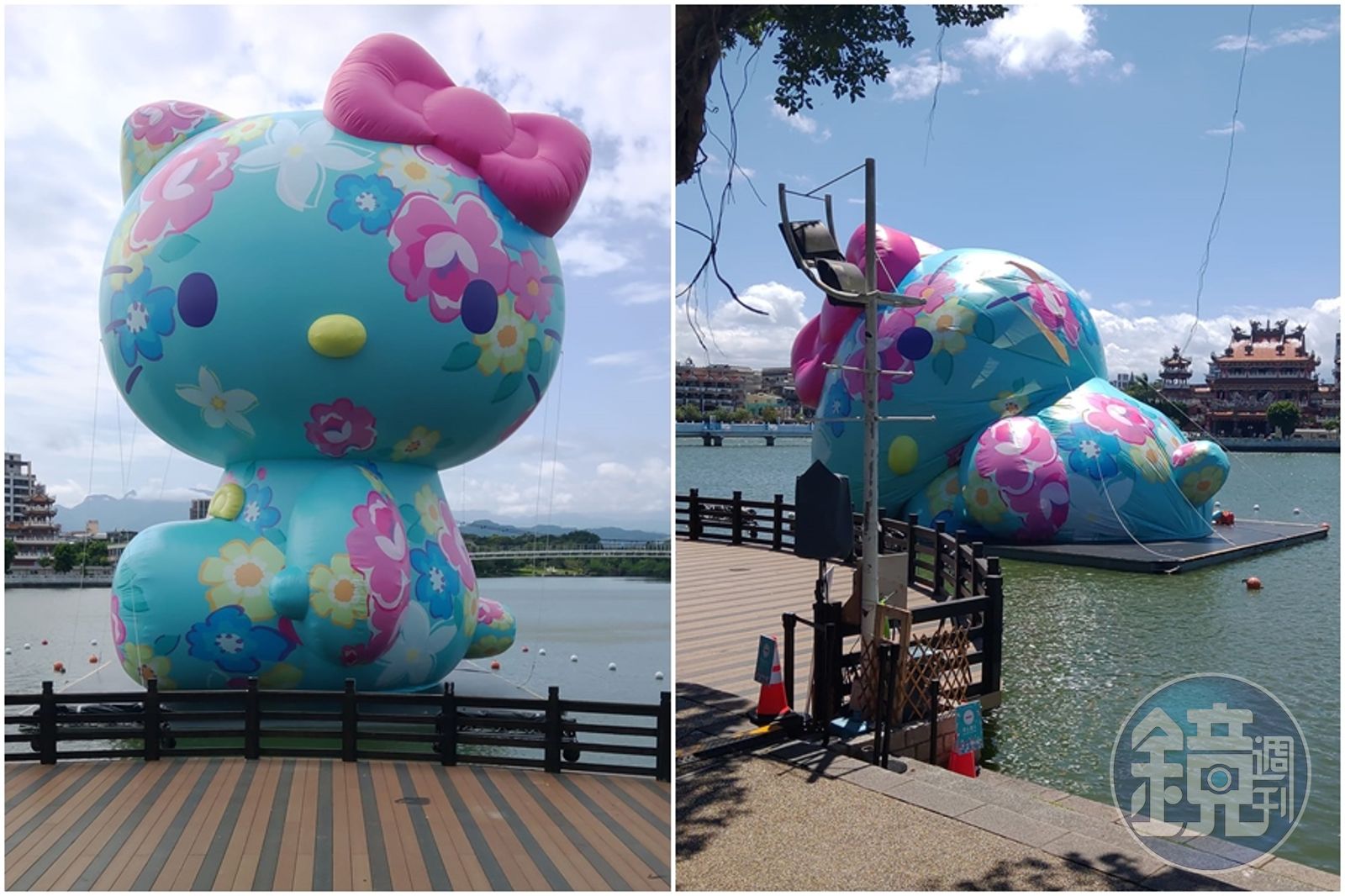 龍潭大池水上Hello Kitty不敵強風消氣了 陸上充氣藝術裝置也暫停展出
