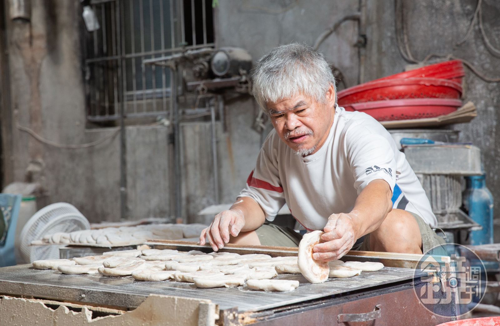 麵粉、二砂糖、鹽、酵母、五香粉放進機器攪揉、發酵,切割麵糰成每份35克,壓平後再放到特製鐵板上煎。帶熱度的水潤餅,看起來樸實,口味卻不簡單,一口咬下,先是鹹甜,咀嚼後淡淡肉桂香從麵香裡竄出,隱藏版吃法包肉鬆、抹果醬,都讓人欲罷不能。
