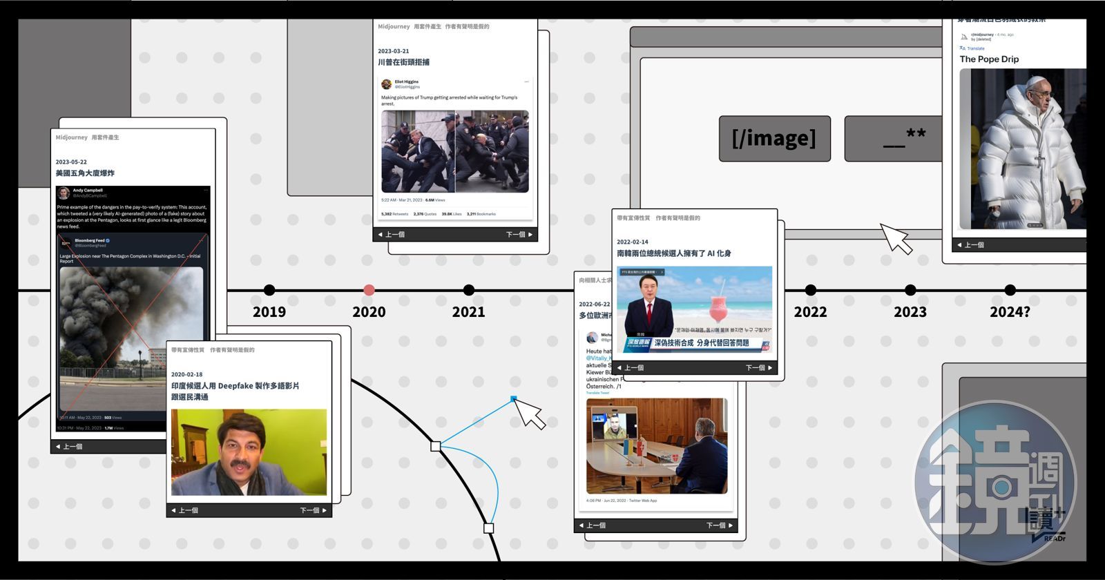 美國總統川普被起訴後,一張張川普在大街上抗拒被逮捕的照片在社群網站上被瀏覽了將近 500 萬次,而這些照片的作者開源調查網站 Bellingcat 的創辦人希金斯(Eliot Higgins)辯稱,「我只是在鬧著玩,」他接受華盛頓郵報的採訪時說,「我以為只有 5 個人會轉發它。」
