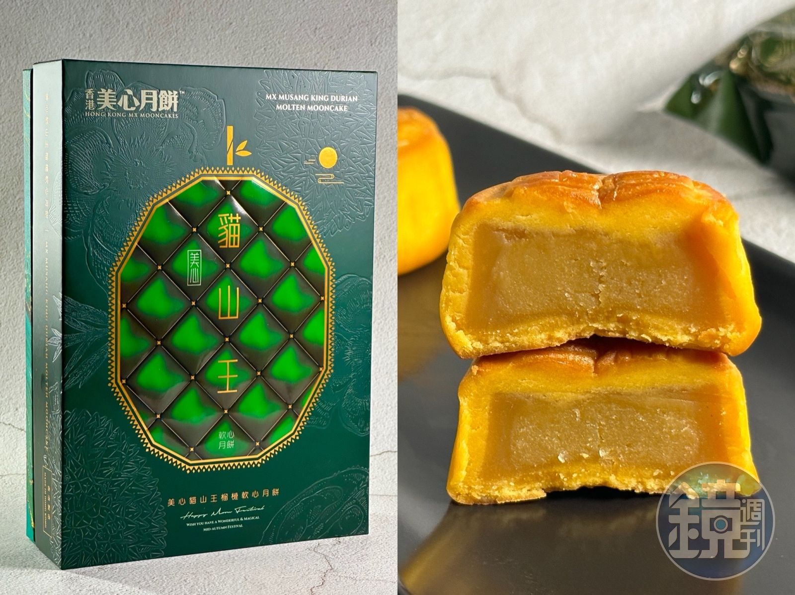 不愧是蟬連超過20年,香港銷量第一的月餅品牌,光看外包裝設計,就充滿質感。全新推出的美心貓山王榴槤軟心月餅,外盒以斑蘭葉綠的色調,呼應貓山王榴槤的產地馬來西亞,榴槤圖案鑲著金邊,又用會反光的綠色菱格紋,讓整個禮盒有種低調奢華感。我把照片放上IG限動,朋友不是問我月餅好不好吃,而是盒子可不可以送給她。