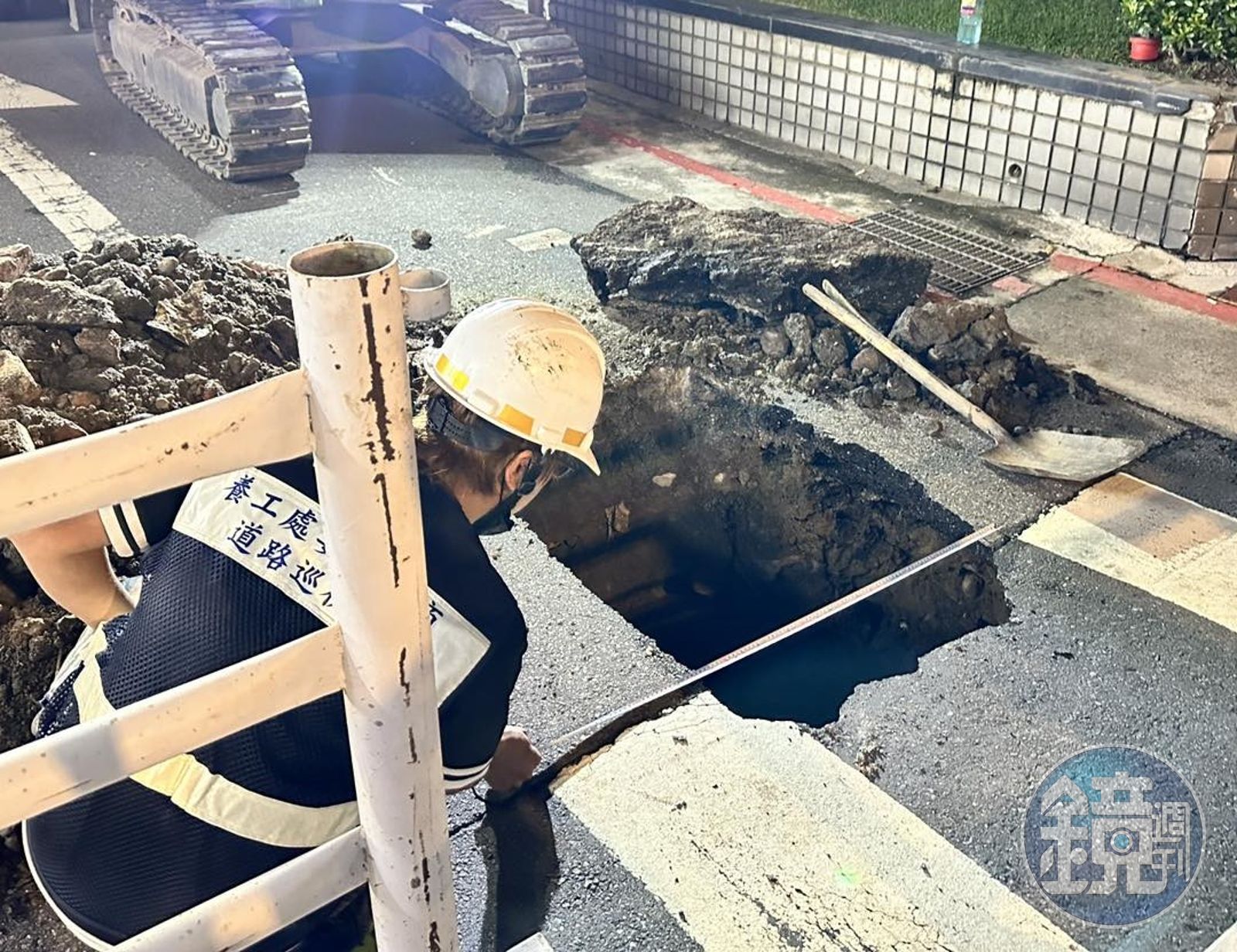 顏若芳今(20日)1時許發文指出,台北市政府新建工程處昨晚23時許開始施工搶救,並於0時許找到原因,「是旁邊側溝有破洞漏水,地下土壤被側溝漏水帶走,導致路面坍塌」,「先用工程技術先將側溝破洞阻擋,防止漏水、再填補水泥進去,明天天水利處緊急進場修補側溝破損,預計天坑搶救的工程在清晨6點可以完成。」