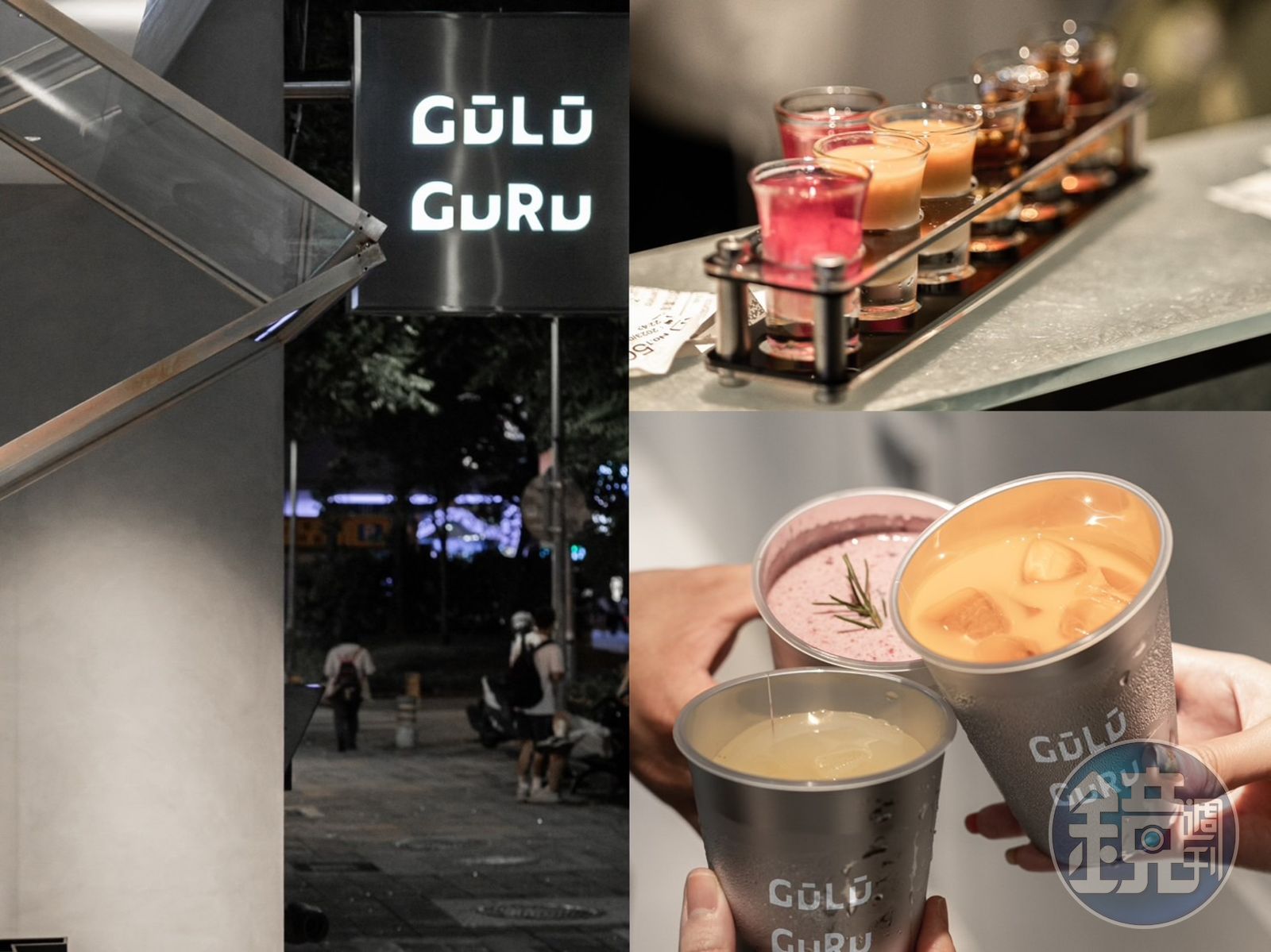 「GULU GURU 酒調實驗室」位於台北大巨蛋商圈,靠近捷運國父紀念館站出口,全開放式的店面空間,從裡到外看得一目瞭然,以灰、銀色為主軸的明亮內用空間除了吧台座位區,另外也有屬於站位的鑲牆的壓克力小桌,即使一個人來小酌一杯也愜意沒負擔。GULU GURU還有一個迷人的外帶窗口,讓大家可以如同買手搖飲一般,把想喝的調酒插上吸管帶著走。