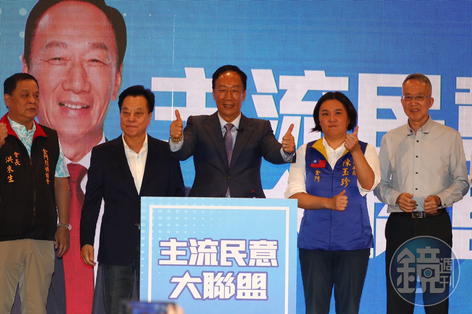 今天的金門場「主流民意大聯盟」造勢,於盈春閣餐廳席開近80桌,聲勢相當浩大,不只國民黨籍在地議長洪允典現身作陪,尋求連任的國民黨立委陳玉珍亦出席,其中陳雖被安排與郭一起坐主桌,但她未上台致詞。