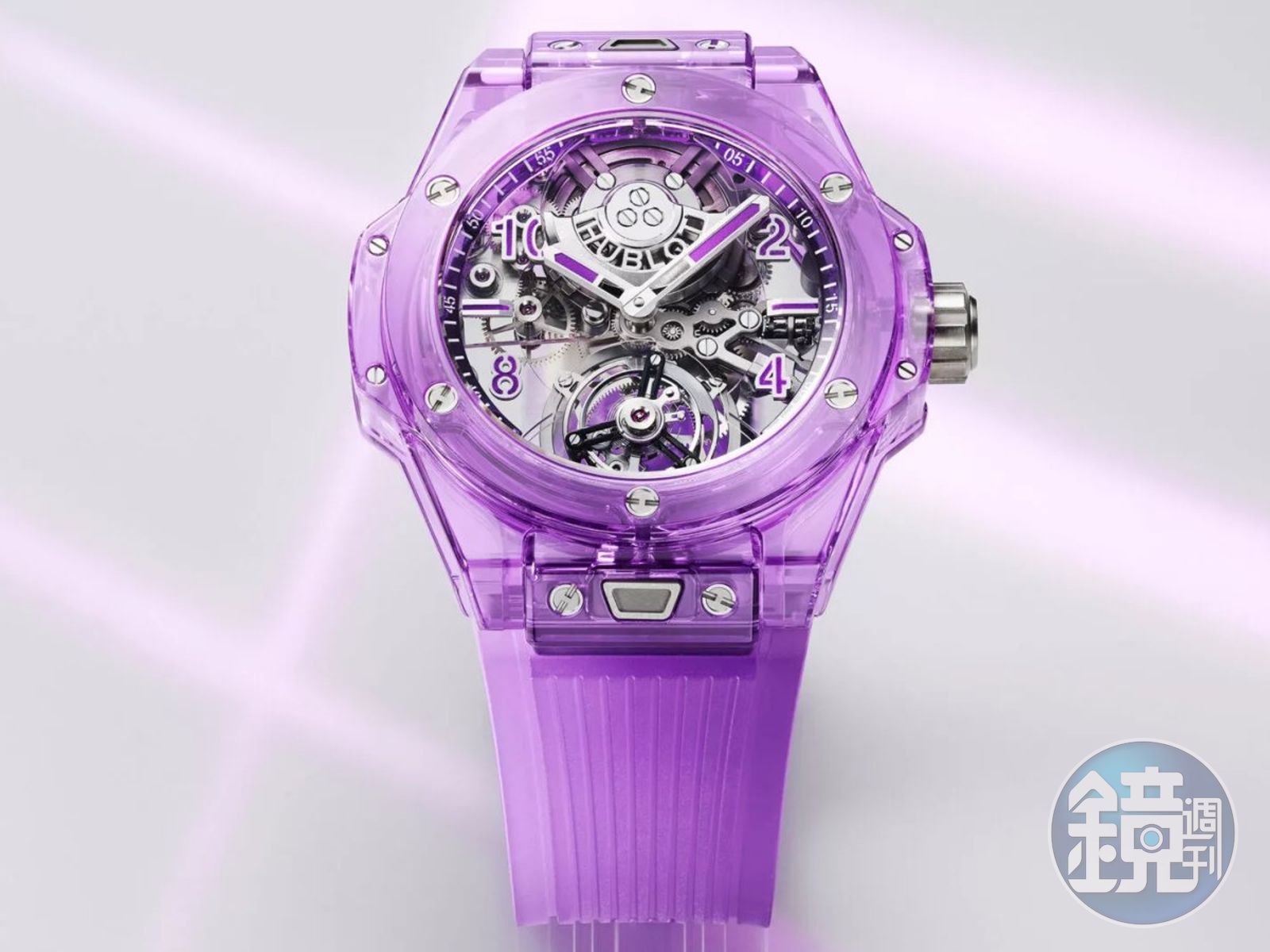 紫色,是錶壇近期開始默默崛起的全新色彩趨勢,許多獨立製錶與頂級品牌,已經開始在其特殊的限量版本之中運用紫色,並有可能會在明年的新錶作品中全面爆發(想想這幾年的藍、綠、冰藍、鮭魚色的潮流)。然而,HUBLOT是在2022年時,就搶先發表了「紫色藍寶石水晶」錶款,除了運用在其「自動上鏈陀飛輪」腕錶之外,也推出酒桶型錶殼「五日鏈」腕錶。