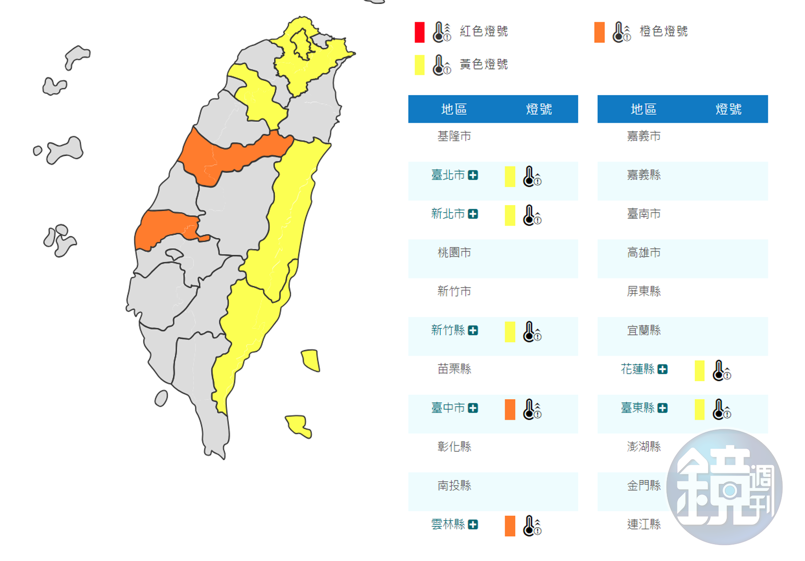 中央氣象局指出,23日中午前後台中、雲林縣為橙色燈號,有連續出現36度高溫的機率,請加強注意;台北市、新北市、新竹縣、花蓮縣、台東縣等地則為黃色燈號。