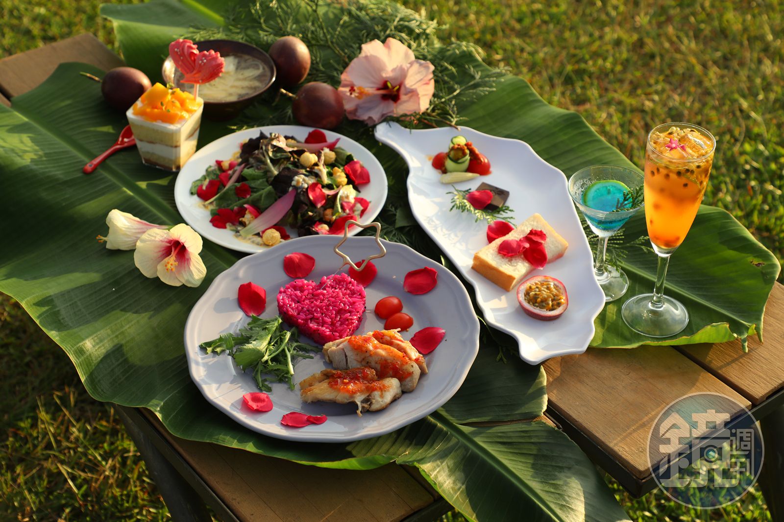 「百香檸檬魚」使用大坪頂百香果搭配檸檬與辣椒,賦予鯛魚片酸甜風味。「椒麻紅玉雞」口感鮮甜軟嫩,沾上含刺蔥、花椒、辣椒與檸檬汁的醬汁,風味獨特。主廚以百香果、五葉松等埔里食材調製餐前與餐後雞尾酒。主菜「椒麻紅玉雞」挑選同樣是在夏夜開花的火龍果製作紅色米飯入菜,口感軟嫩的日月潭紅玉雞,搭配刺蔥、花椒、辣椒與新鮮檸檬汁,是一道香麻且誘人想來杯啤酒佐餐的菜餚。一邊看著夕陽逐漸落下山頭,一邊喝著主廚精心調製的美酒,我正陶醉在埔里獨有的浪漫晚霞裡。