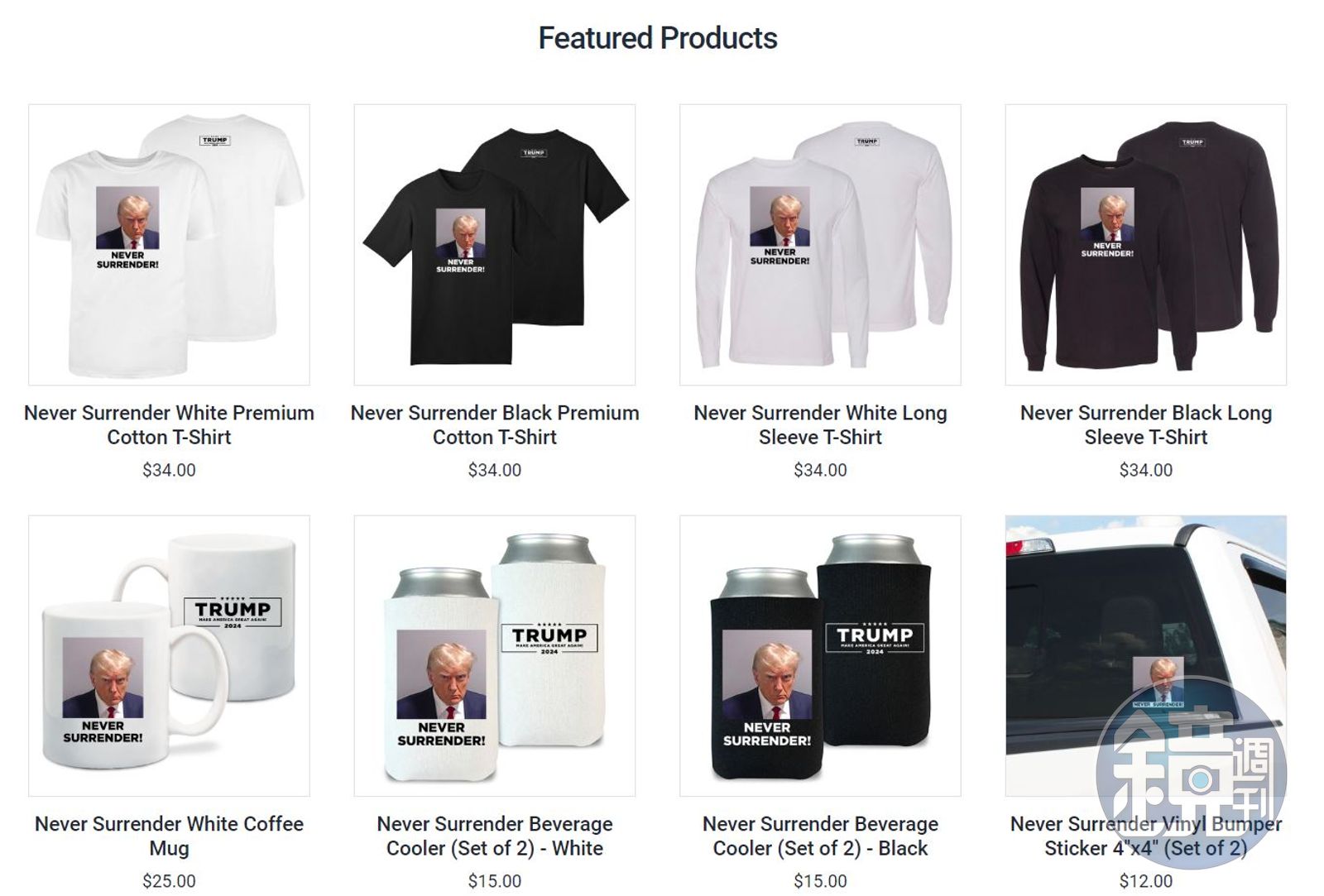 而川普也在個人競選官網上架嫌犯照周邊商品,包含34美元(約新台幣1,081元)的短袖T恤黑白2色及長袖T恤黑白2色、25美元(約新台幣795元)的馬克杯、15美元(約新台幣477元)的啤酒保冰套黑白2色,以及最便宜的、12美元(約新台幣381元)的汽車貼紙,全都印上川普嫌犯照以及「NEVER SURRENDER!」字樣。