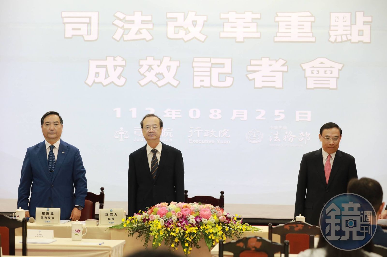 今天的記者會由司法院長許宗力、行政院政務委員羅秉成及法務部長蔡清祥聯袂出席,從七大面向及三大重點進行專題報告,說明自司法改革國是會議於2017年8月12日舉行總結會議以來,6年司法改革的重點成效。
