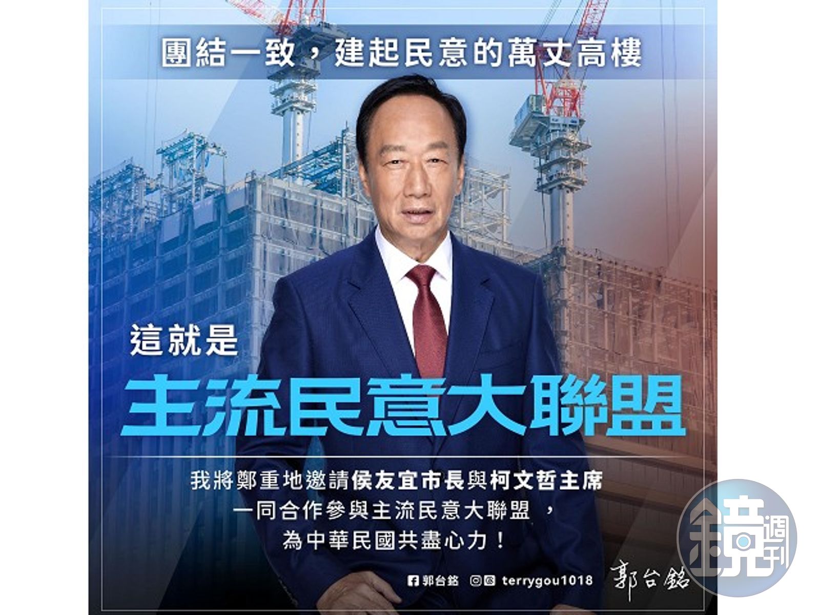 郭台銘今日發表參選宣言時提到,自己原本沒必要出來選,但是「中間聲音不能缺席」,因此他的參選,主要目的就是要促成在野陣營的整合,不要便宜民進黨總統參選人賴清德。郭台銘還表示,他一直提倡「主流民意大聯盟」,就是希望匯集非綠陣營的民意聲音。郭台銘稱,期許自己能成為團結的最大公約數,更將繼續邀請侯友宜與柯文哲「一起坐下來,你喝咖啡,我喝奶茶,一起好好商談國家大事」。