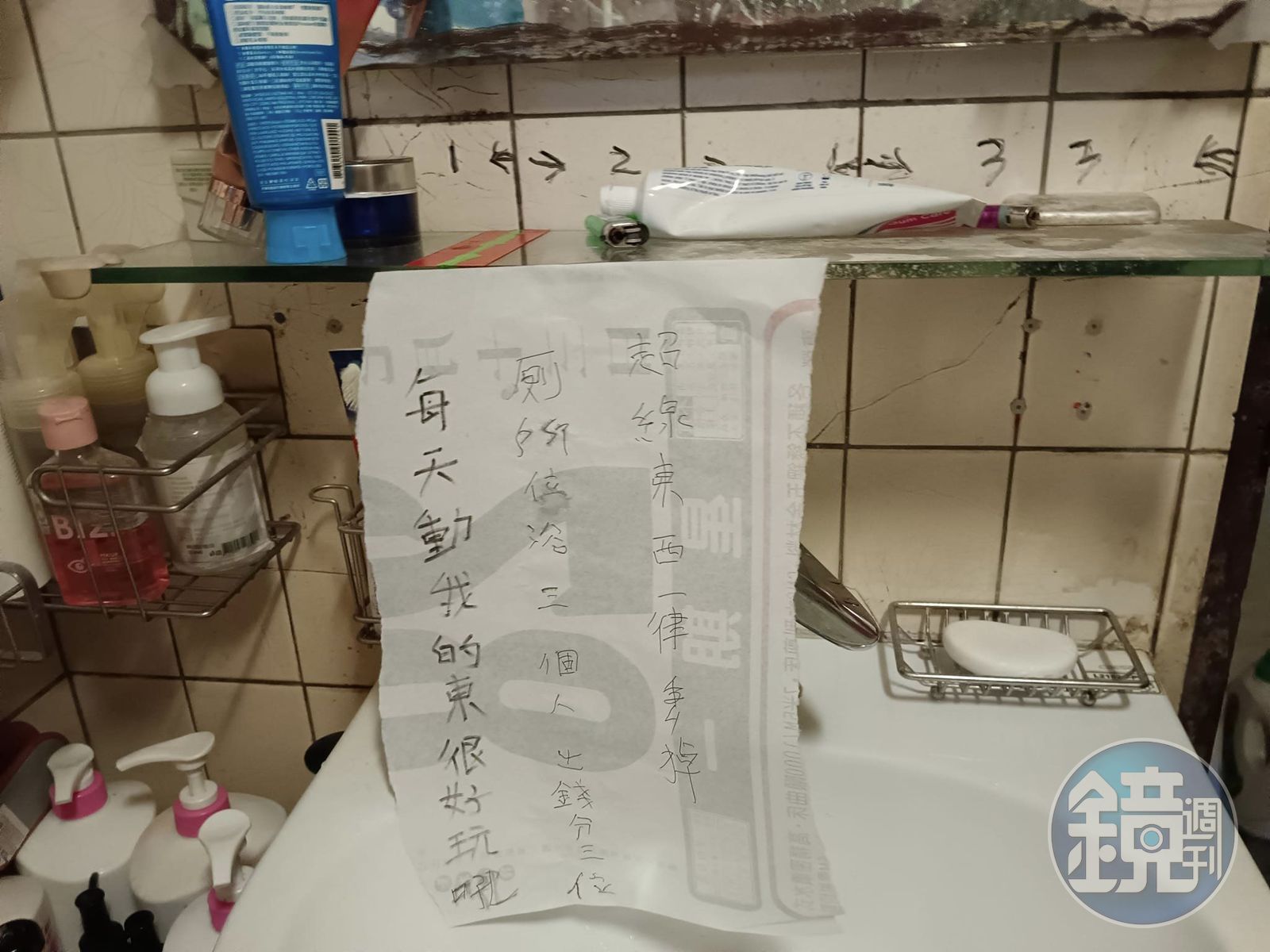 原PO還發了2張照片,透過照片可見為浴室的洗手槽置物檯面,牆面用筆畫記分成了3等分,清楚標示1、2及3的區塊,親戚則以日曆紙的背面寫著「每天動我的東(西)很好玩吼,廁所位(衛)浴3個人,出錢分3位,超線東西一律丟掉」。