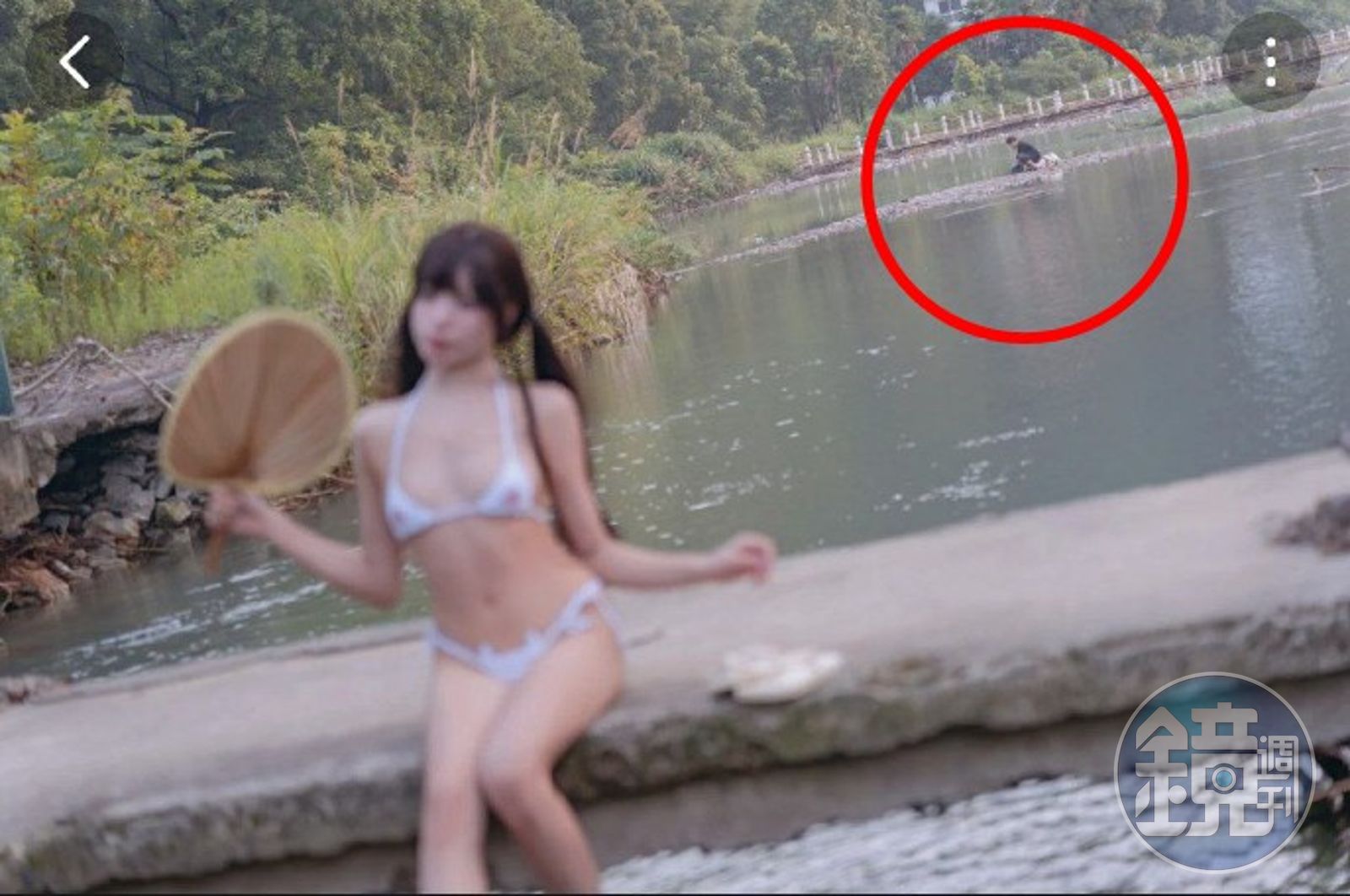 正妹網紅只穿清涼比基尼外拍,釣魚翁在旁展現「色即是空」。(翻自微博)發布時間:2023.08.30 14:30 臺北時間
