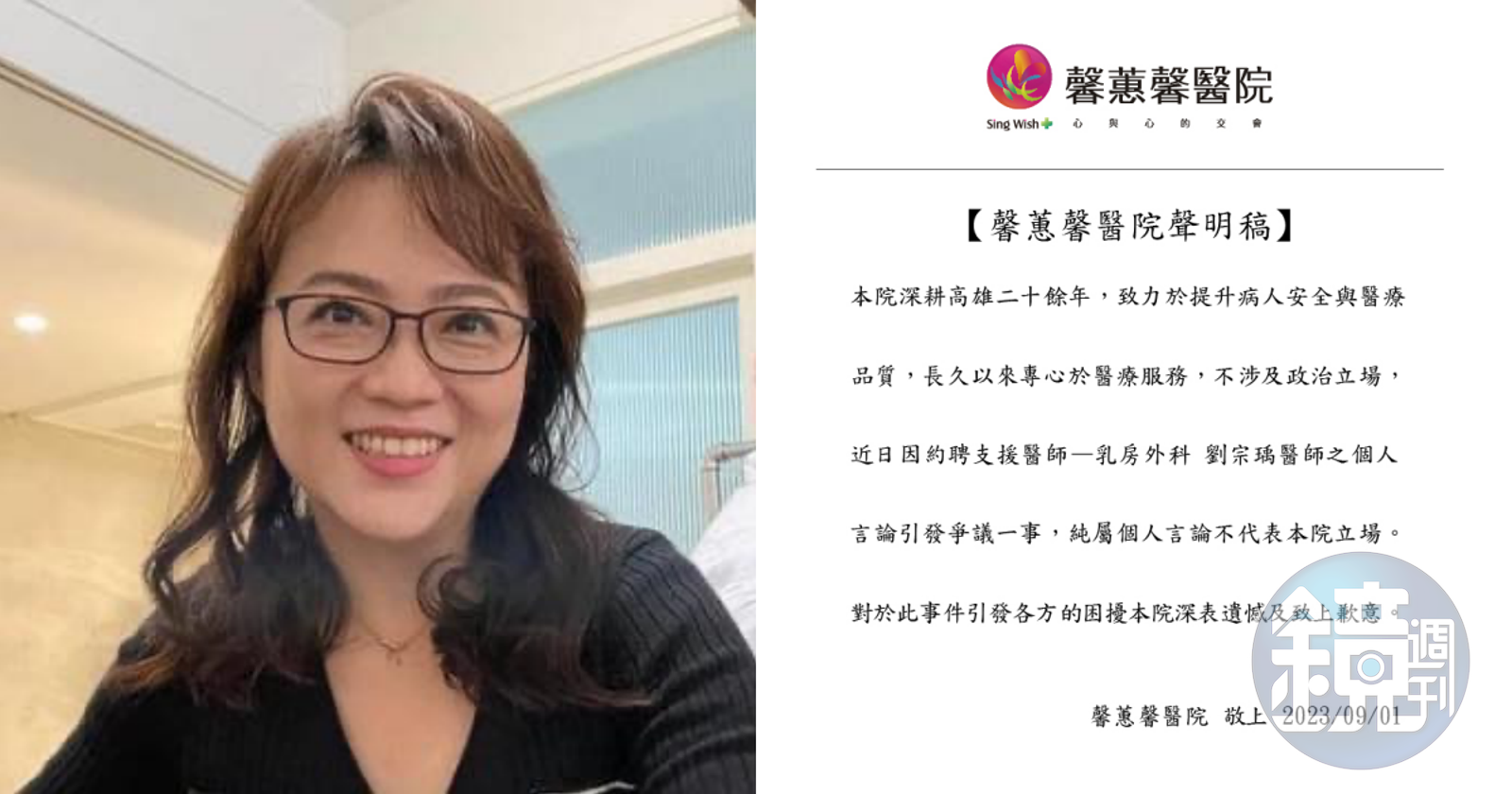 劉宗瑀也因此遭酸「從零開始養 側翼篇」等語,憤怒的網友湧入其臉書、任職醫院留言灌爆,其中馨蕙馨醫院今日發聲明切割,「本院深耕高雄20餘年,致力於提升病人安全與醫療品質,長久以來專心於醫療服務,不涉及政治立場,近日因約聘支援醫師一乳房外科劉宗瑀醫師之個人言論引發爭議一事,純屬個人言論不代表本院立場。對於此事件引發各方的困擾本院深表遺憾及致上歉意。」另一間阮綜合醫療社團法人阮綜合醫院則未做出任何回應。