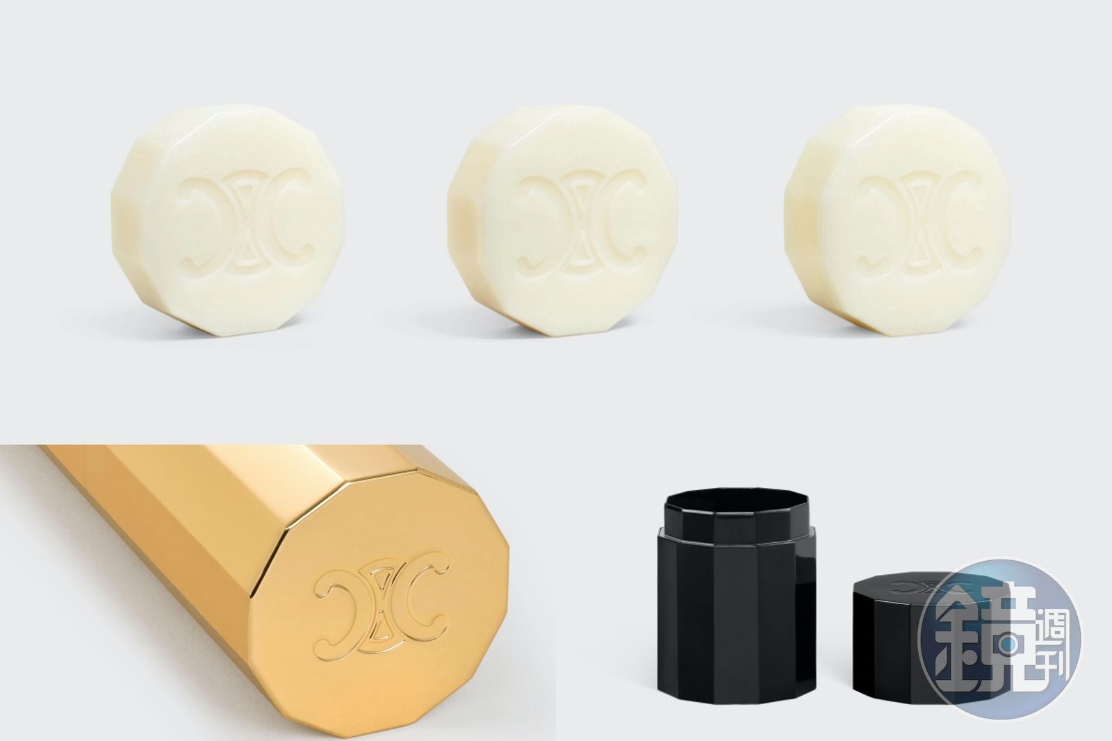 「TRIOMPHE」標誌刻在皂體正面。(CELINE提供)香氛皂套裝CELINE HAUTE PARFUMERIE。NT$3,600(CELINE提供)金色飾面鋁質化妝棉罐。NT$14,000(CELINE提供)黝黑色鋁質肥皂盒。NT$8,900(CELINE提供)有了香氛皂,讓我們也看看MAISON CELINE浴室配件部分吧!包括肥皂盒、棉簽罐、化妝棉罐以及牙刷盒以便於攜帶為出發點,採用輕質鋁製成,外觀傳承自17世紀末古典主義的極簡美學,每個配件的蓋子上都刻有品牌的「TRIOMPHE」標誌,有黑色和拋光金色2種飾面可供選擇。