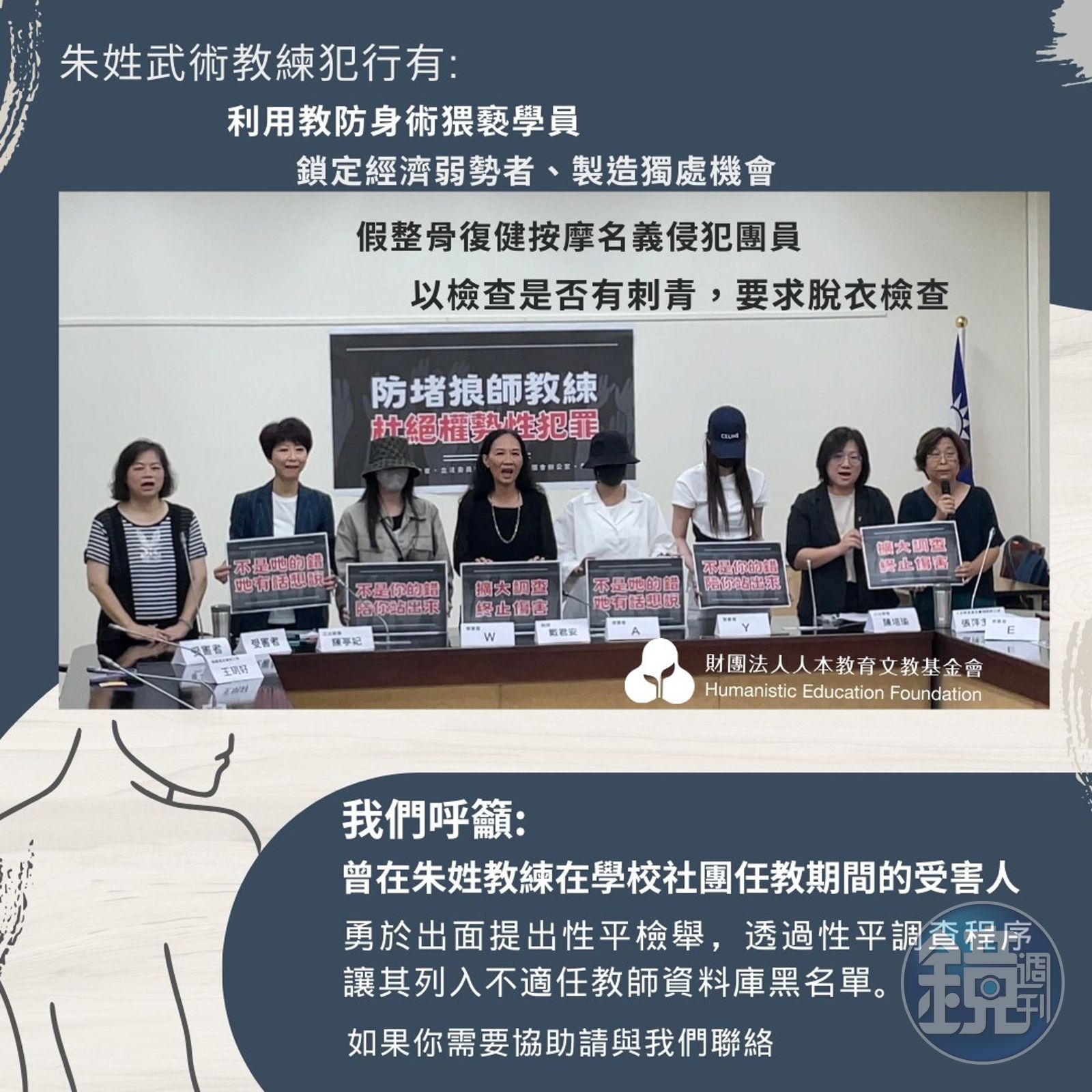 針對多名被害人指控朱姓教練惡行,人本教育基金會也呼籲,希望被朱姓教練侵犯過的受害人,勇於出面提出性平檢舉,並透過性平調查程序,讓其列入不適任教師資料庫的黑名單,以維護諸多被害女性權益。