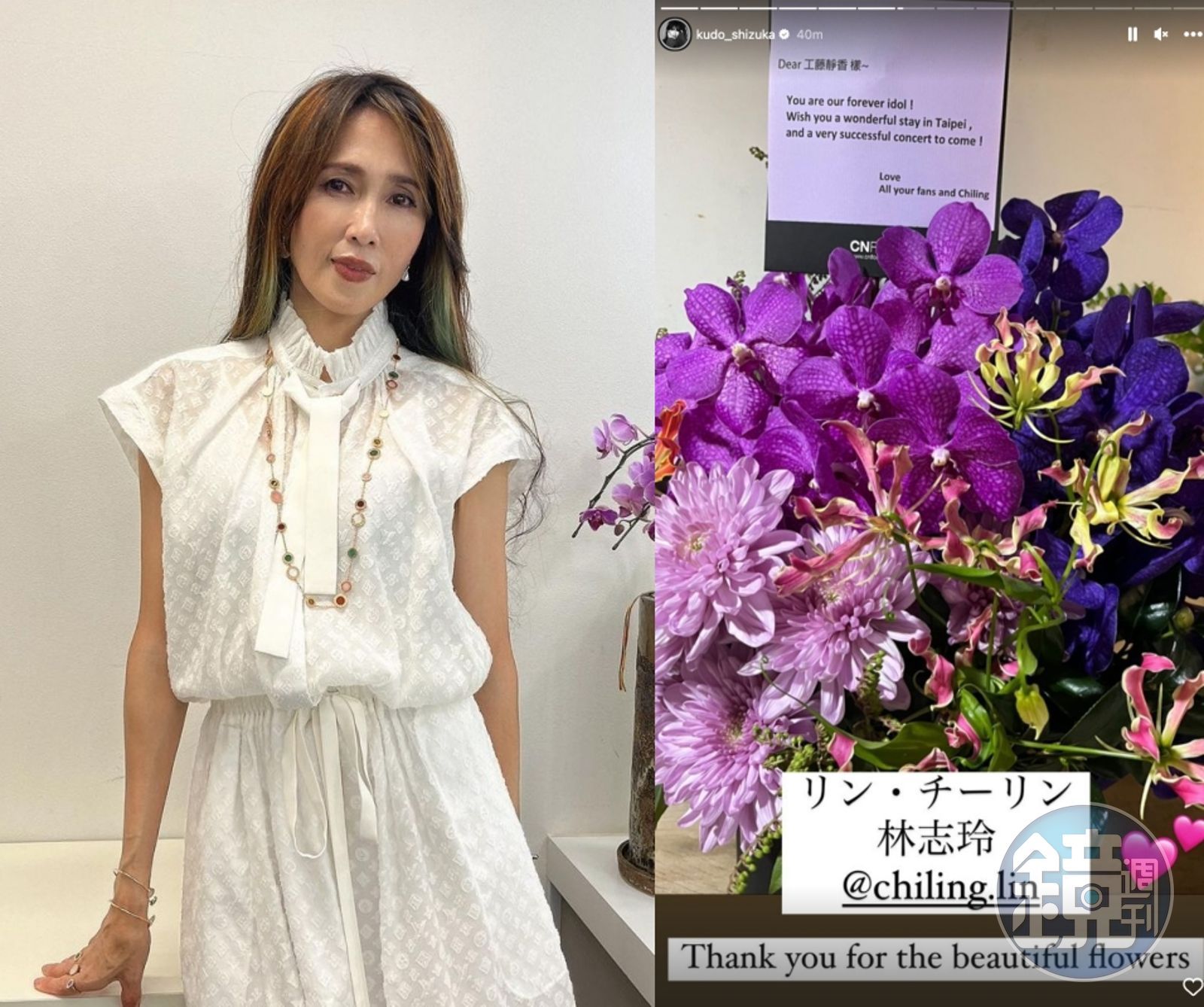 限動看到工藤靜香收到許多祝福花禮,包括林志玲送上知名花坊的花禮,附上英文卡片寫著,「妳是我們永遠的偶像!希望妳在台北度過愉快的時光,並祝福演唱會大成功。」卡片結尾以「全體粉絲和志玲」落款,再次呈現「志玲姐姐」貼心的一面。另外,羅志祥也送上粉紫玫瑰、蝴蝶蘭與白色繡球花搭配的花禮祝賀。