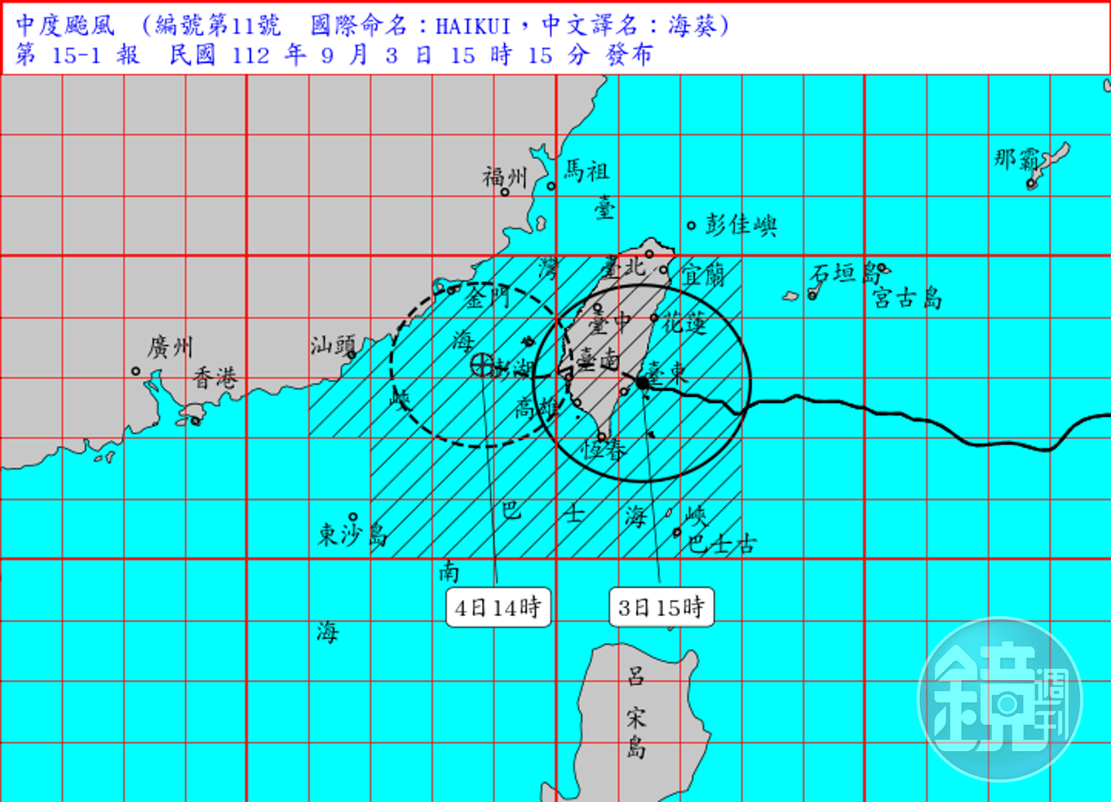 劉宇其說,暴風圈有機會於明天晚上脫離台灣,但環流仍持續影響南部與金澎,整體解除陸上颱風警報預計是週二白天,海警則須待到週二深夜,但預報不確定性高,還須密切注意。