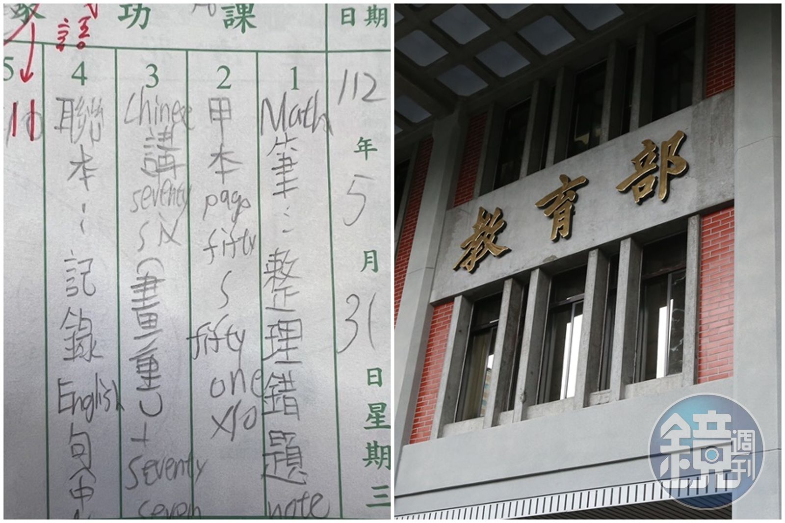這名孩子就讀國小及國中的家長,4日在PTT八卦板貼出孩子聯絡簿上中英文夾雜的晶晶體,如「甲本page fifty~fifty one」「訂簽Math筆、Chinese筆」「本週book…」「心得or發現or提問」等回家作業事項,且這種寫法還是學校要求的,家長氣憤表示「你告訴我這他媽的不中不英的東西是什麼?」痛罵教育官員腦袋裝屎,「這種東西,語文會學好我輸你!X!」