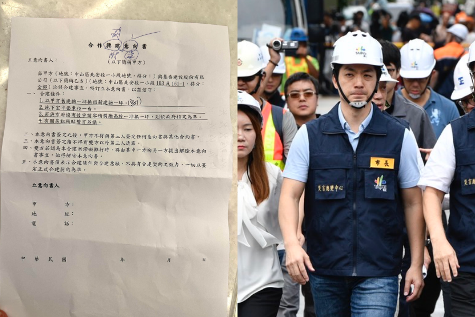 從林珍羽曬出的「合作興建意向書」可見,基泰提出的合建條件包括:1.以甲方(居民)就建物一坪換回新建物一坪。2.地下室平面車位一位。3.若與市府協商後申請容積獎勵高於一坪換一坪,則依政府核定為準。4.有關房租補貼雙方另議。