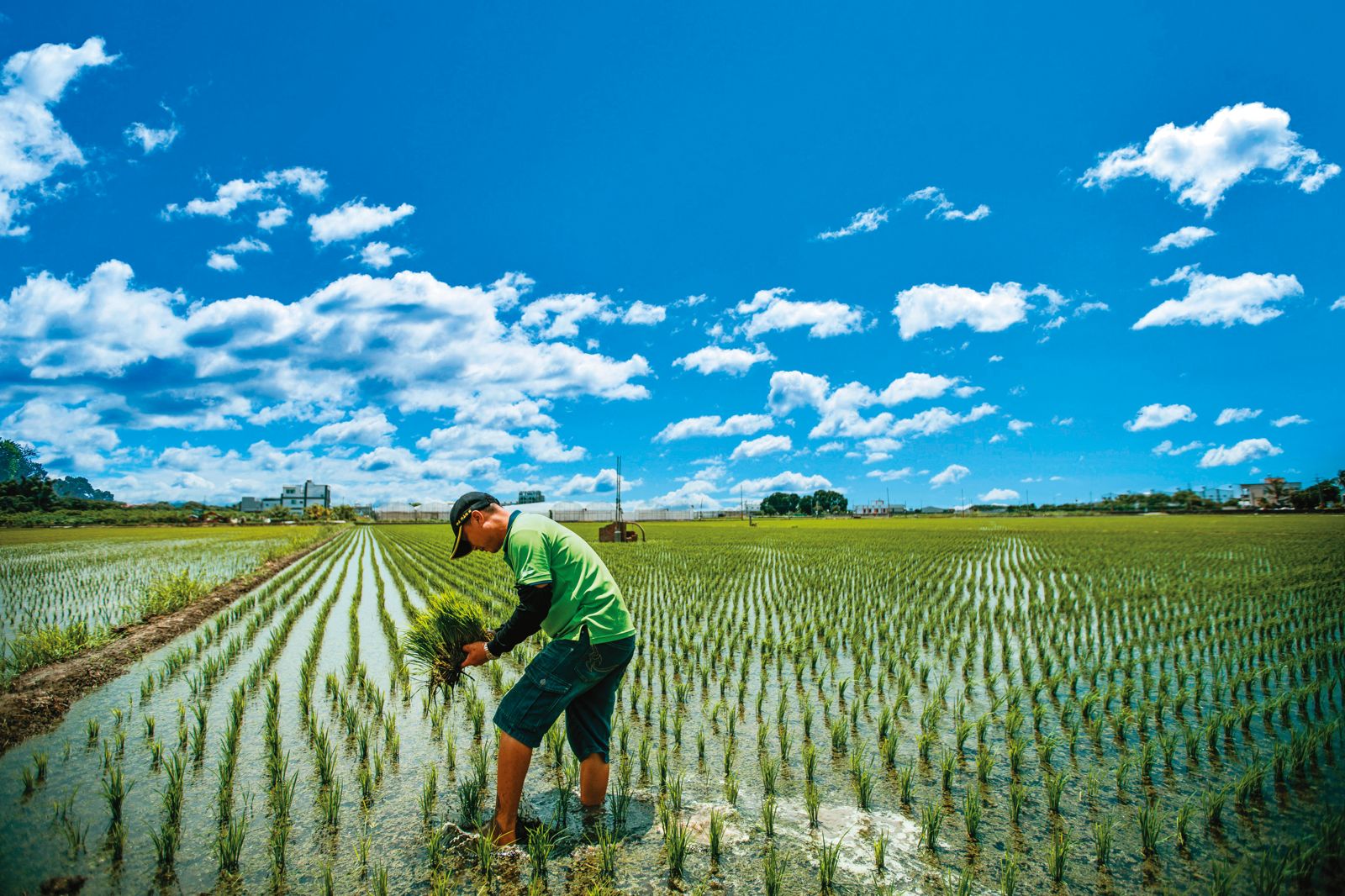 村裡一半的水稻田剛插秧,另一半則因水庫缺水而停灌。氣候變遷加劇乾旱,嘉南二期稻停灌,是30年首見。嚴佳祥的田多位在不需停灌的井水區,他得以照常下田耕作,一張臉曬得黝黑發亮。