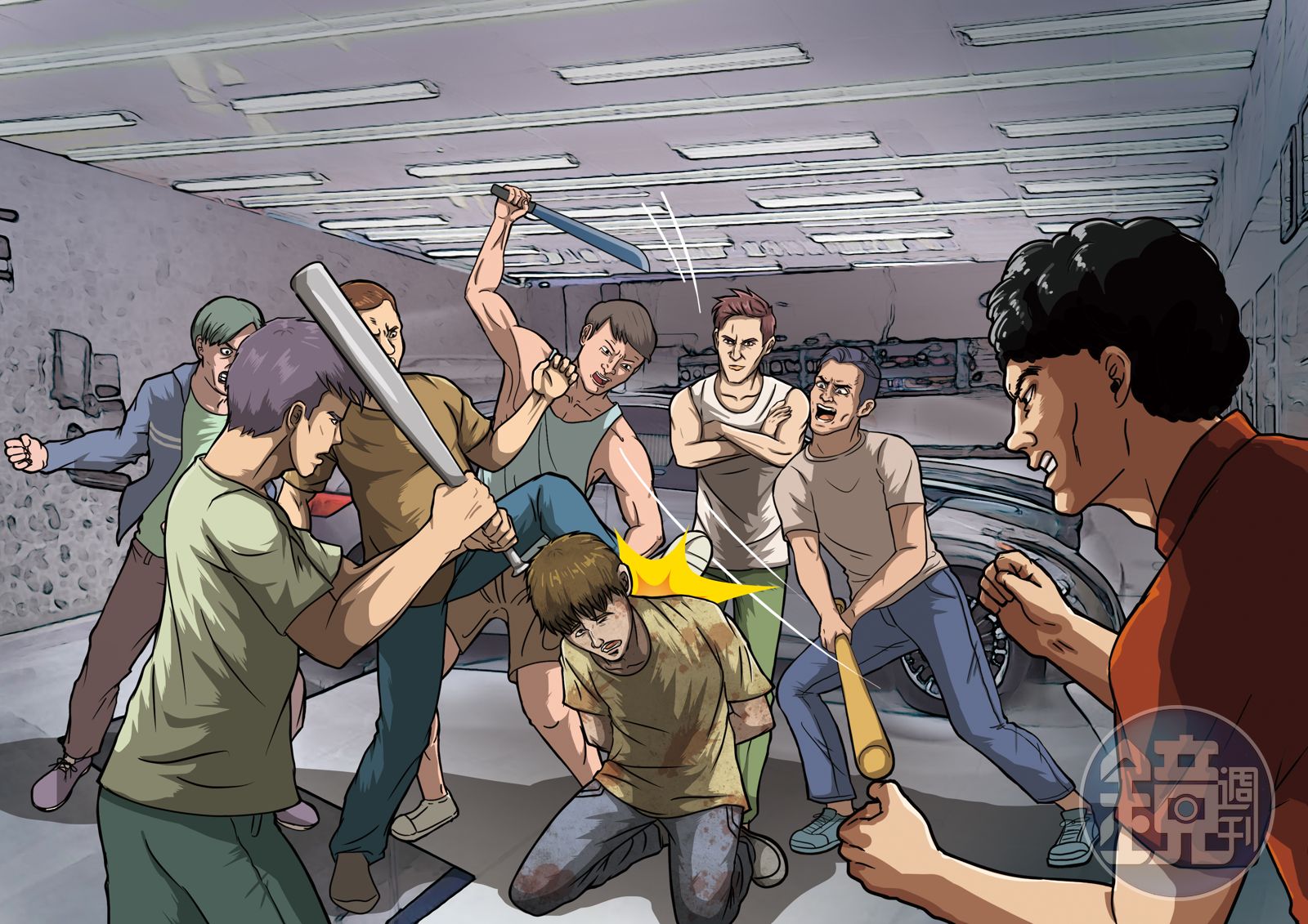 監視器畫面顯示,被害人不斷哭著求饒,央求這群惡煞不要再打,但眾人根本聽不進去,場面形同失控,棍棒不斷齊下,猛朝被害人的頭部等要害下手,有人還對他拳打腳踢,被害人遭凌虐1個半小時後,已虛脫無力,癱倒在地不起。