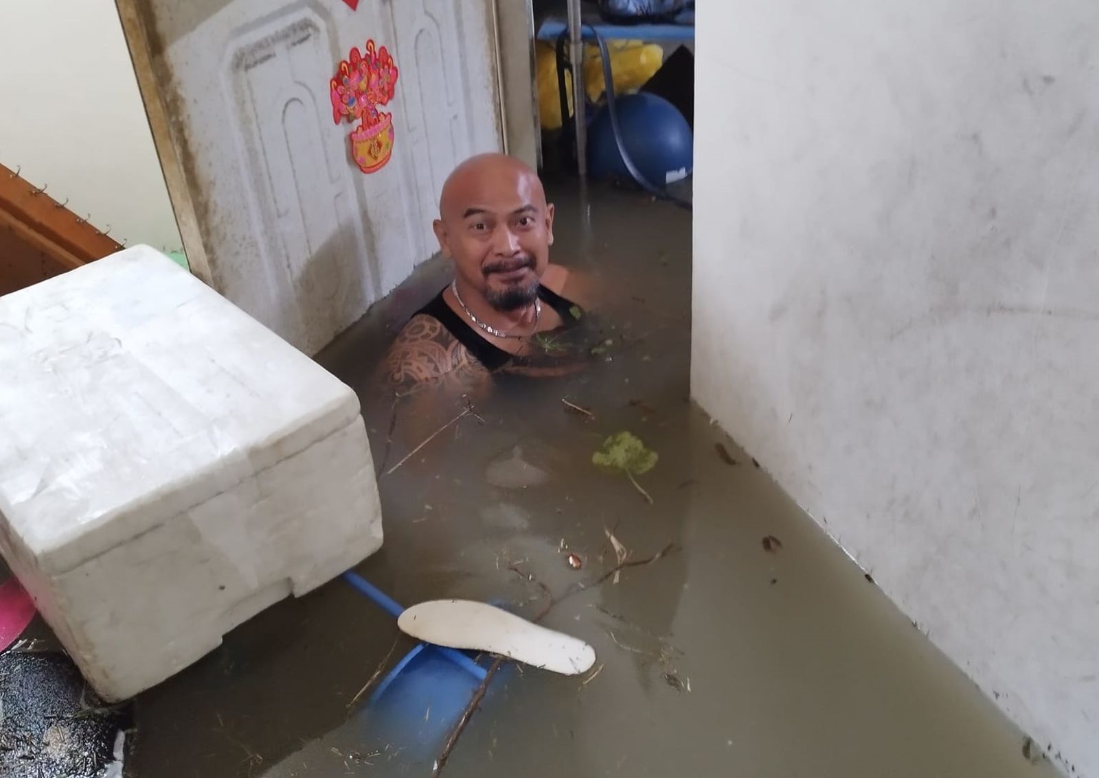 事後更有網友神到本尊帳號,原來當事者是「玩命光頭」義興閣掌中劇團第三代演員王勇達,他昨在臉書PO文大呼,「赤蘭溪水真髒,不到20分鐘我家變游泳池,目前水深150公分」,還在文末強調3次,「不是拍戲、不是拍戲、不是拍戲」,讓不少網友紛紛詢問狀況,他則幽默回應,「順便大掃除汰舊換新,過年省打掃了」「除了濕身,沒大礙」「髒水讓我屁股癢死了」「真的比扯鈴還扯」,事後也表示水已退,在清淤泥中。
