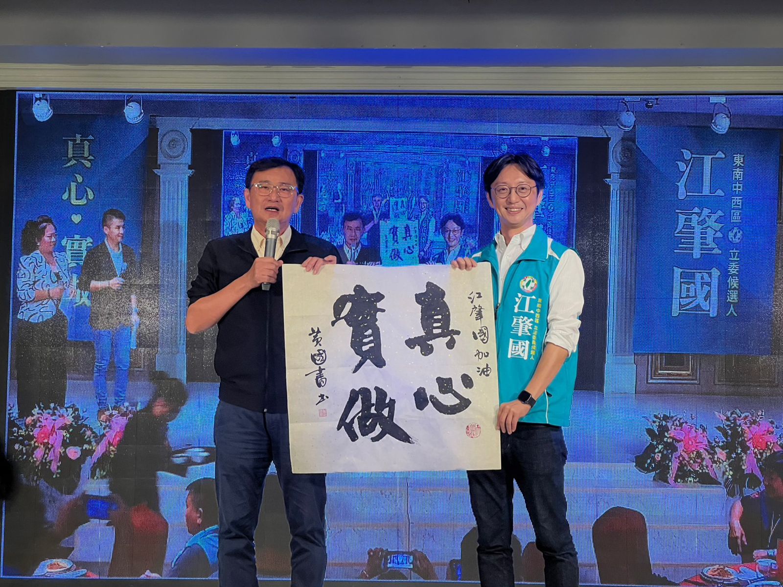 民進黨台中市東南中西區立法委員參選人江肇國昨晚(10日)舉辦募款餐會,包含總統府祕書長林佳龍夫人廖婉如、總統府資政李茂盛、立法院副院長蔡其昌、民進黨發言人林楚茵、立委黃國書、何欣純等各界政壇好友都到場相挺。立委黃國書在場贈送親寫的書法「真心實做」給江肇國,傳承意味濃厚,更邀請江肇國及2位立委同台飆唱,展現傳承交棒、大合作的氛圍。