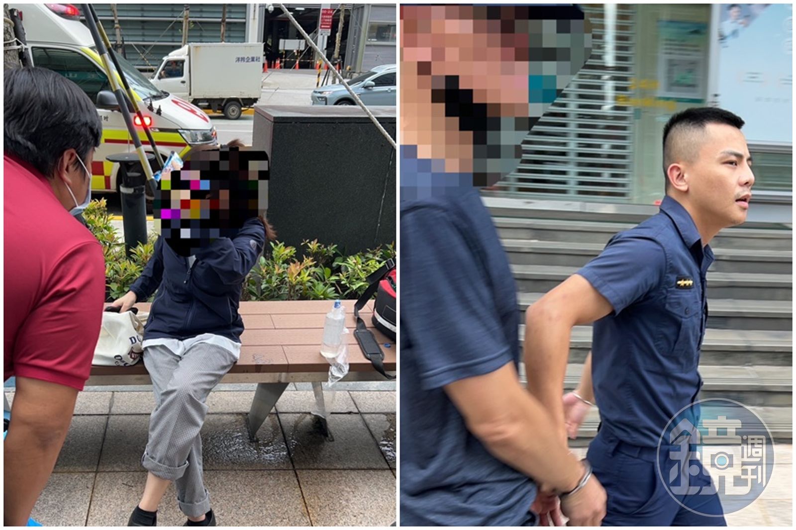 警方將涉嫌用防狼噴霧行搶的鄭男(右)捕到案,范女因臉、眼遭防狼噴霧噴灑感覺不適,但無大礙。(翻攝畫面)發布時間:2023.09.13 17:54 臺北時間
