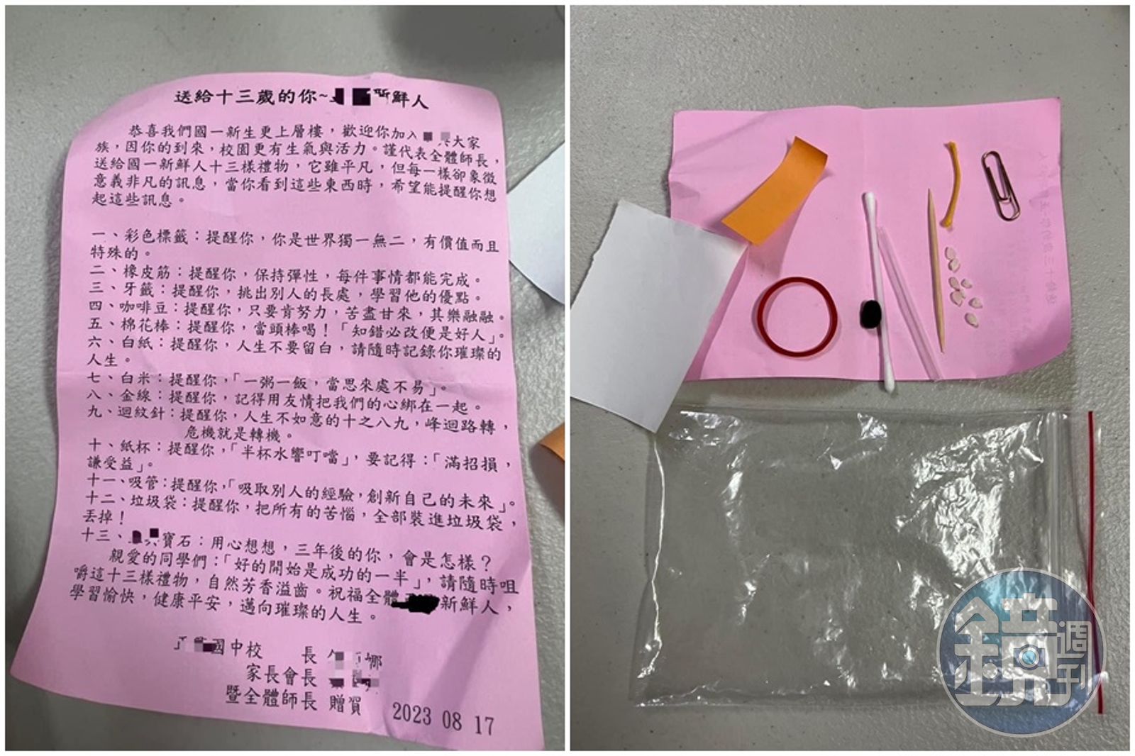 一名網友在PTT八卦板分享該校送給新生的13樣入學禮,紙條上寫道「它雖平凡,但每一樣卻象徵意義非凡的訊息」,希望學生往後能隨時咀嚼這13樣禮物,適時提醒自己禮物想傳達的涵義。