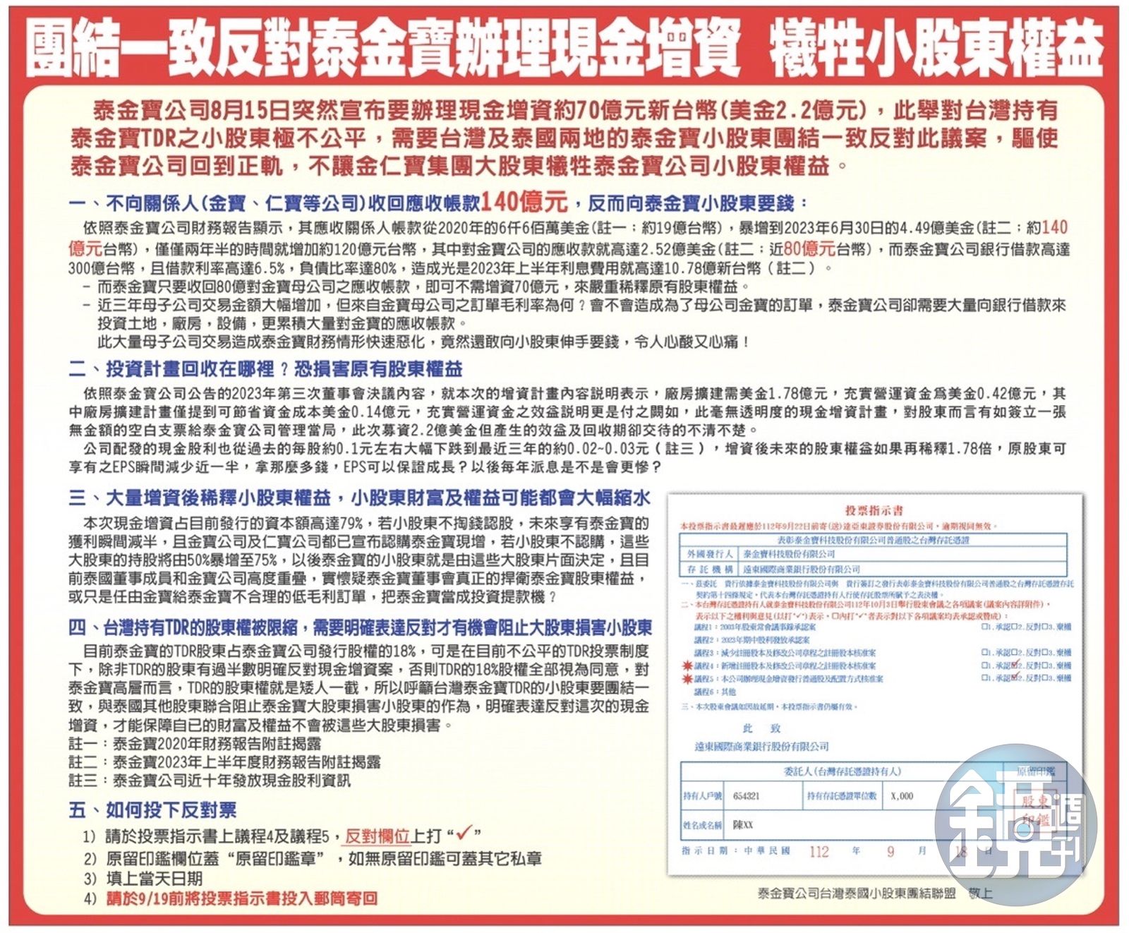 目前泰金寶公司在台灣發行TDR,占泰金寶公司股份約18.22%,但TDR的投票權計算,必須要持有TDR的股東過半數明確表示反對現金增資意見,存託機構才會將反對票數反映在泰金寶股東會中,若持有TDR的泰金寶股東,有超過半數表達同意現金增資或不表達意見,存託機構即可將TDR股權18.22%全部投下同意現金增資票,換句話說,假設49%的TDR股東投下反對票,仍視為全部TDR股東同意,所以TDR股東權不是一人一票,而是對公司派完全有利的贏者全拿制度。