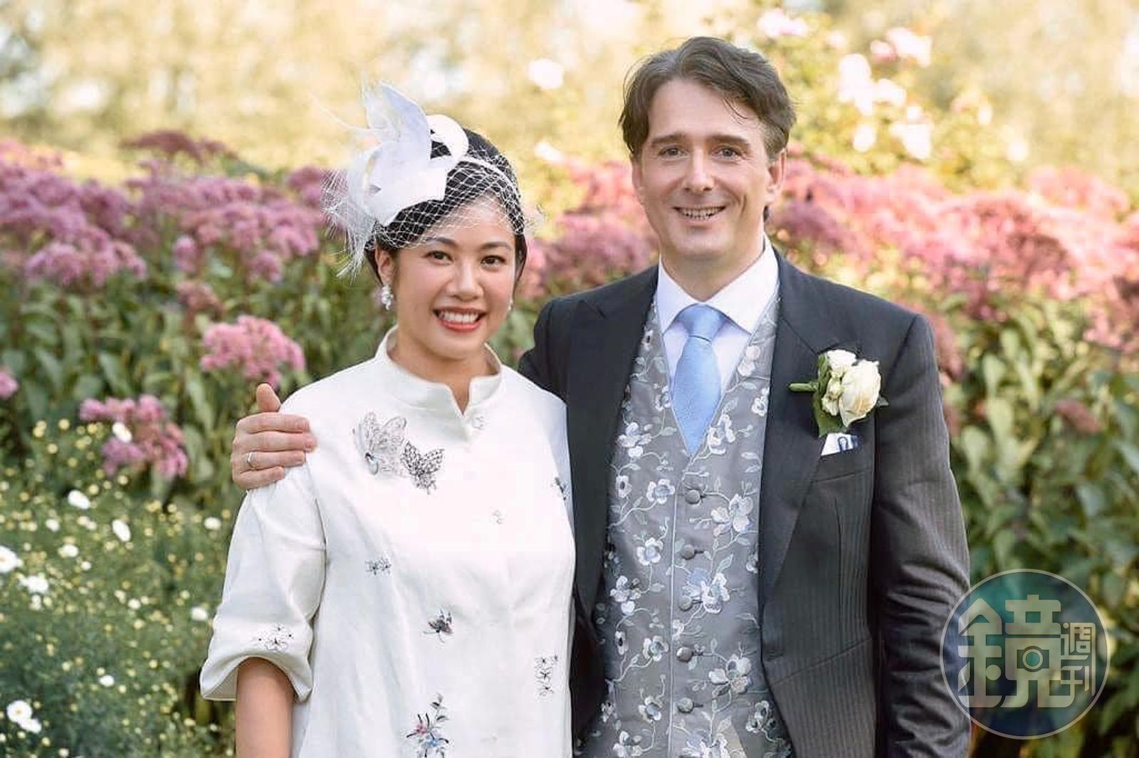 吳欣盈挑選夏姿的米白色洋裝與外套,外套上是中式刺繡,花紋淡雅,相當襯托吳欣盈的氣質,吳欣盈當天還別著兩朵古董蝴蝶別針,「這別針是Cynthia媽媽許嫺嫺的,和婚禮禮服的花朵相映成趣。」Cynthia友人說。