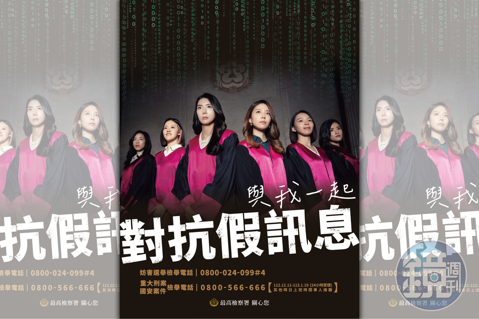 因應明年總統副總統與立法委員二合一選舉,強力嚴防境外勢力、錯假訊息及選舉賭盤介入選舉等行為,經由司法官學院與各地方檢察署推薦,最高檢特別邀請台北地檢署陳品妤檢察官、謝仁豪檢察官;新北地檢署粘鑫檢察官、吳姿穎檢察官;桃園地檢署王海青檢察官;苗栗地檢署曾亭瑋檢察官;台中地檢署侯詠琪檢察官、趙維琦檢察官;高雄地檢署尤彥傑檢察官;宜蘭地檢署蔡明儒檢察官等10位檢察官,共同參與首波海報拍攝。