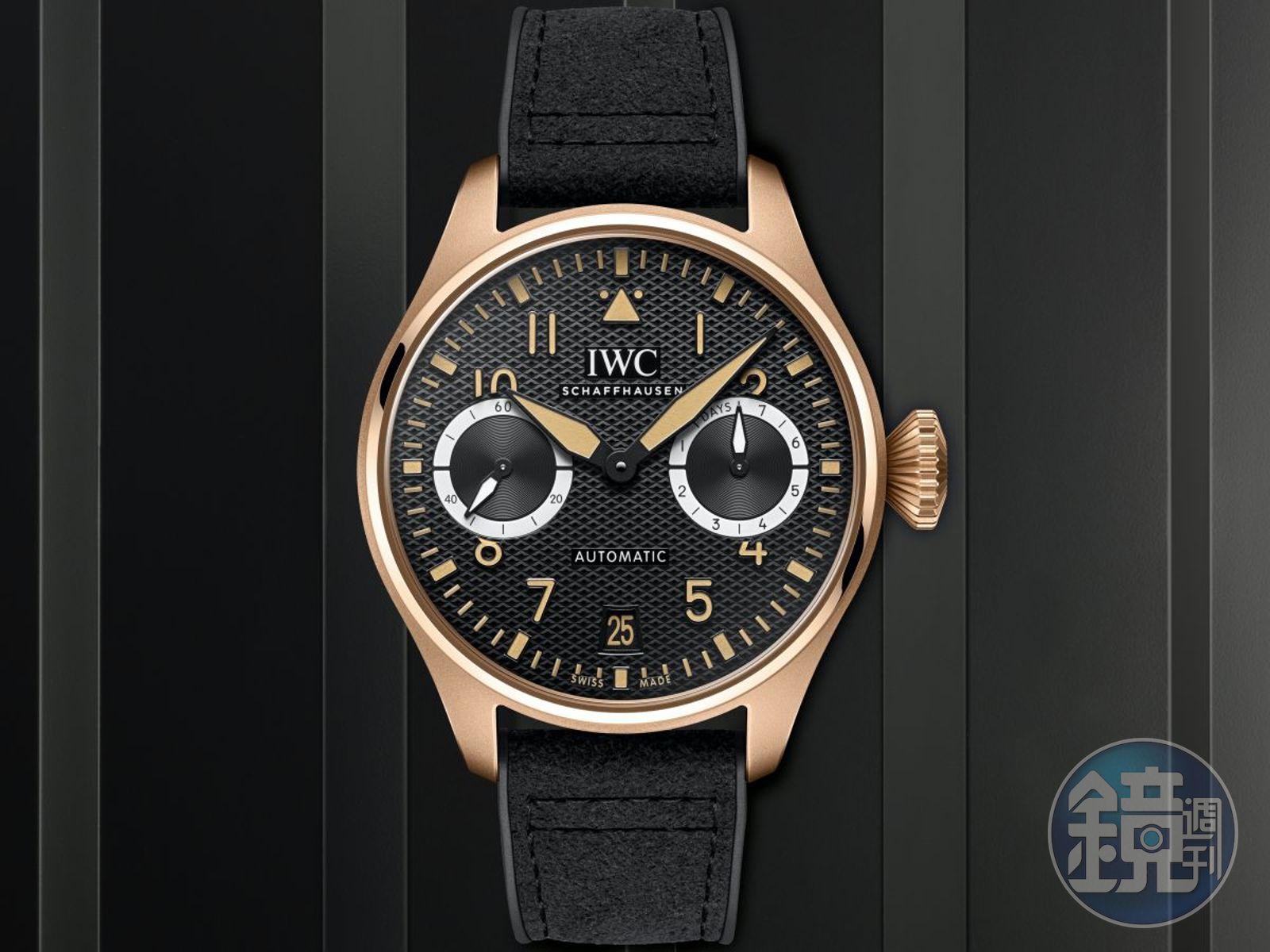 IWC Big Pilot’s Watch大飛行員Mercedes-AMG G63特別版,採用錶壇首見的「陶瓷基複合材料」(CMC),結合碳化矽陶瓷與碳纖維複合材料於一身,打造出過去在IWC錶款中從未見過的外型。定價約NT$1,351,000。改造之三:面盤。這也是一個在IWC飛行員錶上也沒見過的設計。過去,飛行員錶款為了符合「清楚識別」的基本要求,面盤都是非常簡潔的全平面。然而,這款AMG G63大飛的面盤,卻採用「菱格紋」機雕處理,使錶款呈現出一種奢華的氛圍。