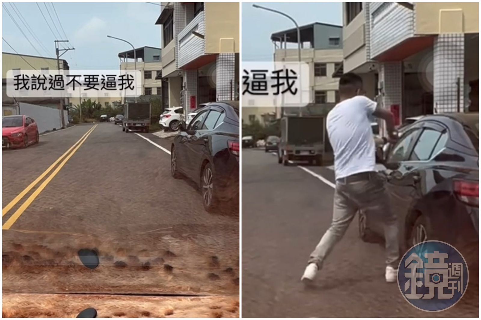 而石男PO出的行車紀錄器畫面可見,除了「我說過不要逼我」字樣,石男下車後相當氣憤砸車,駕駛座車窗瞬間破一大洞。
