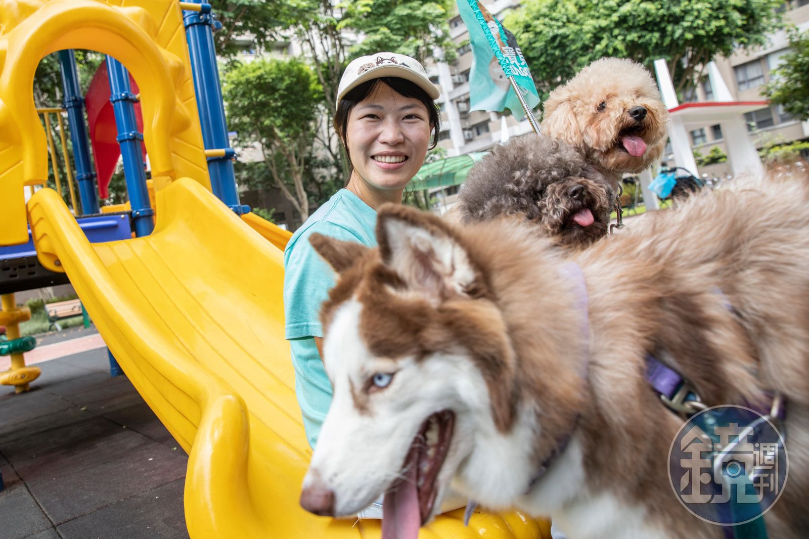 「一開始做寵物線的時候,覺得我們有狗狗可以陪大家很好,是一個團隊的感覺,現在變成我很黏牠們,比較離不開牠們,我們是互相依賴。」她說三隻毛孩脾氣不同,最習慣也適合陪她上班的黑貴賓「嘎逼」,屬於管家婆的個性。
