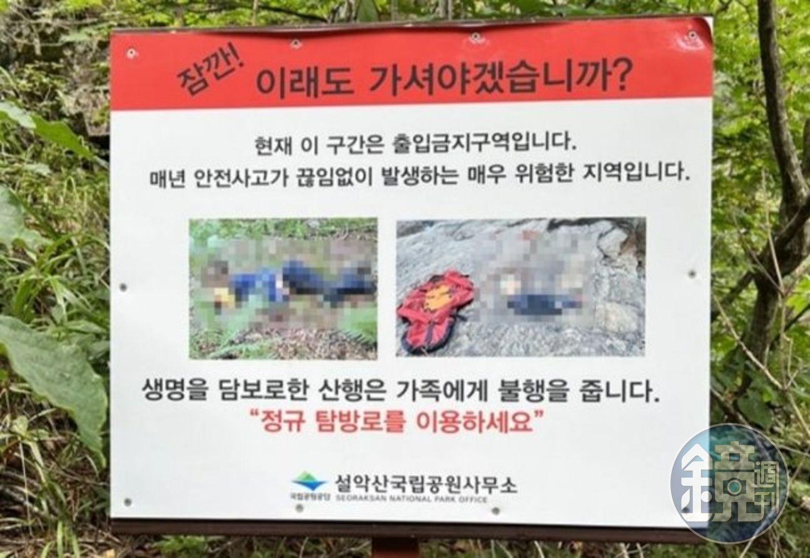南韓著名觀光景點雪嶽山國立公園,日前因為在土王城瀑布附近的禁止進入區域前擺放了一塊驚悚的「屍體告示牌」引發爭議。從南韓網友曝光的照片中可見,告示牌上放上了2張毫無馬賽克的失足登山客遺體照片,並且搭配上文字:「等等!就算會這樣也要繼續走嗎?」提醒民眾不要越線進入禁止區域,否則可能就會像圖上失足的登山客一樣。