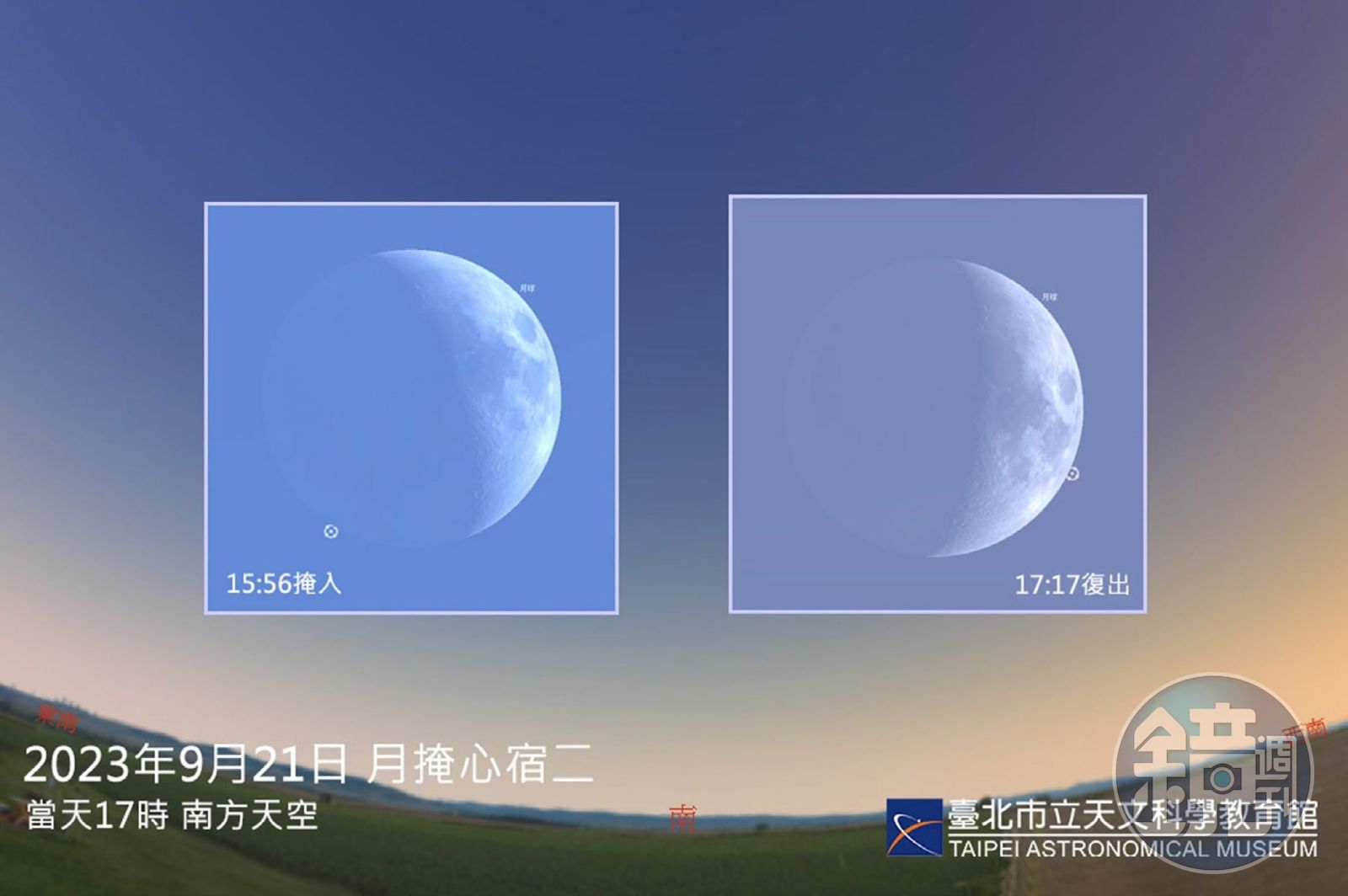 北市天文館指出,當月球在軌道上運行時,偶爾會遮住遠方星體,而發生「月掩星」的現象,21日下午則可觀察到天蠍座主星心宿二的月掩星現象。