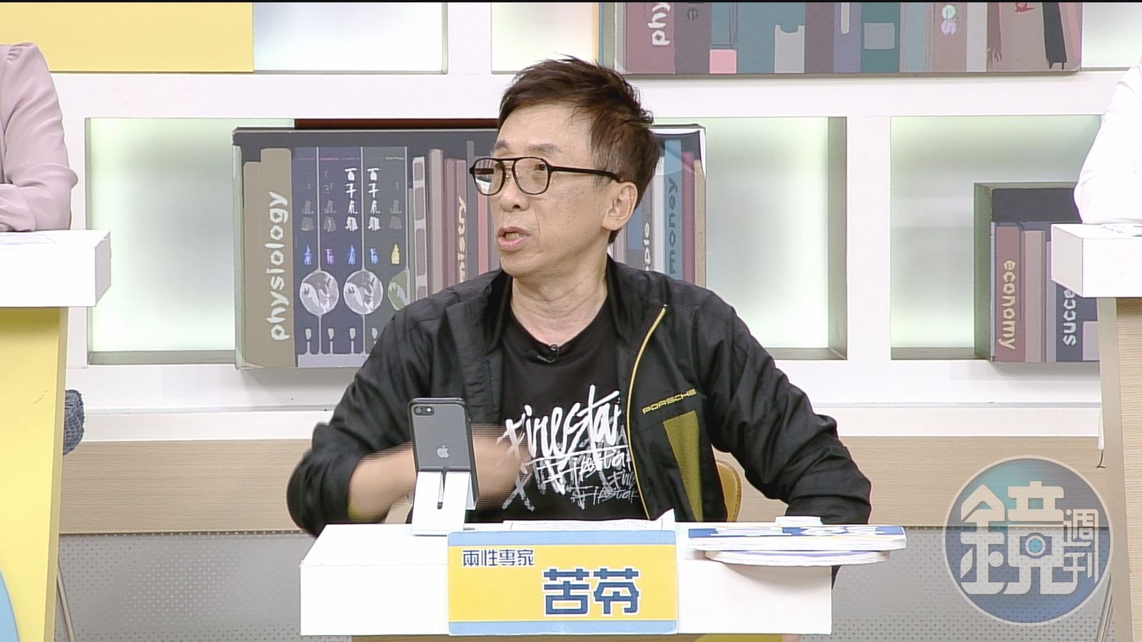 苦苓也提出自己的觀點,愛情的麻煩就是獨佔性,大家要的都是「只」愛不是「最」愛,他甚至提出:「如果反過來問黃秋生,你能接受對方這種做法嗎?」苦苓經營第二次婚姻做好許多準備,「我比我老婆大十歲,早早買好長照險,房子是登記老婆的名字,保險買了一堆,我不希望我老了後老婆還要辛苦照顧我。」