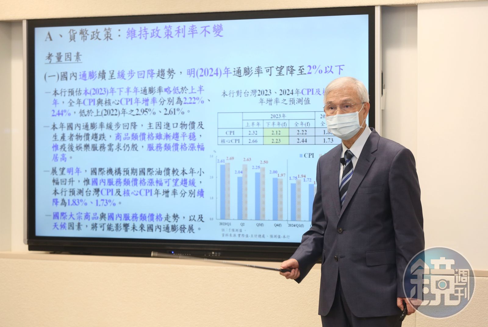 楊金龍在央行理監事會後對外表示,考量國內通膨續呈緩步回降的趨勢,明年(2024)通膨率可望降至2%以下,央行預估,今年下半年的通膨率會略低於上半年,主因是進口物價和生產者物價趨跌,然而商品類價格雖漸趨平穩,但疫後娛樂服務需求仍高,價格漲幅仍居高。