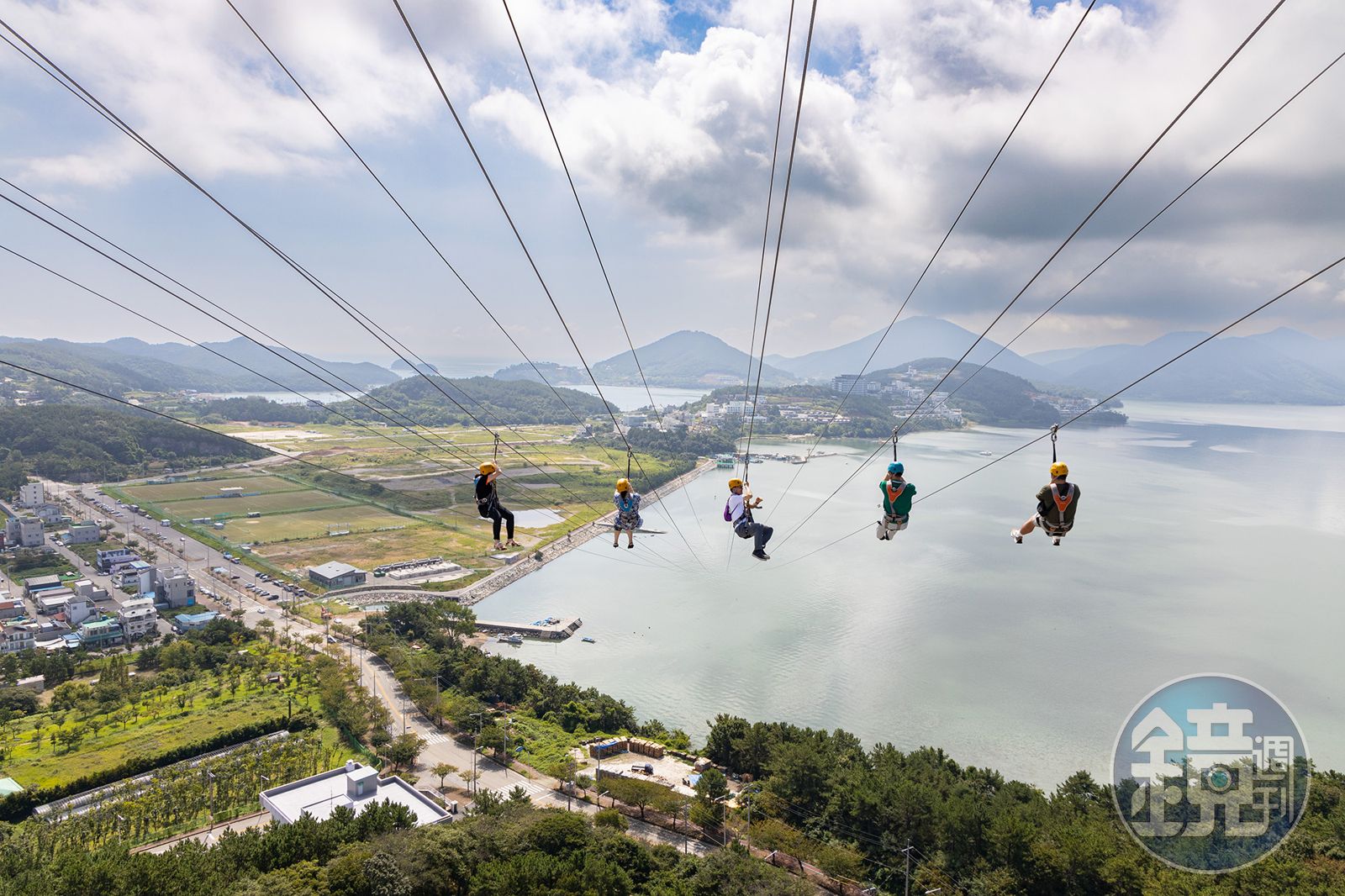 位於南部海岸的麗水,是一座被大海包圍的城市,2021年在「麗水華美達廣場飯店」24樓開幕的高空滑索設施,標榜從130公尺高的飯店頂樓,順著1.2公里長的跨海繩索,以時速80公里橫跨至對岸建築,在這1分30秒的過程中,能跟另外5個同伴一起在高空尖叫驚呼,以腿軟與顫抖的體感欣賞麗水的蔚藍海岸。