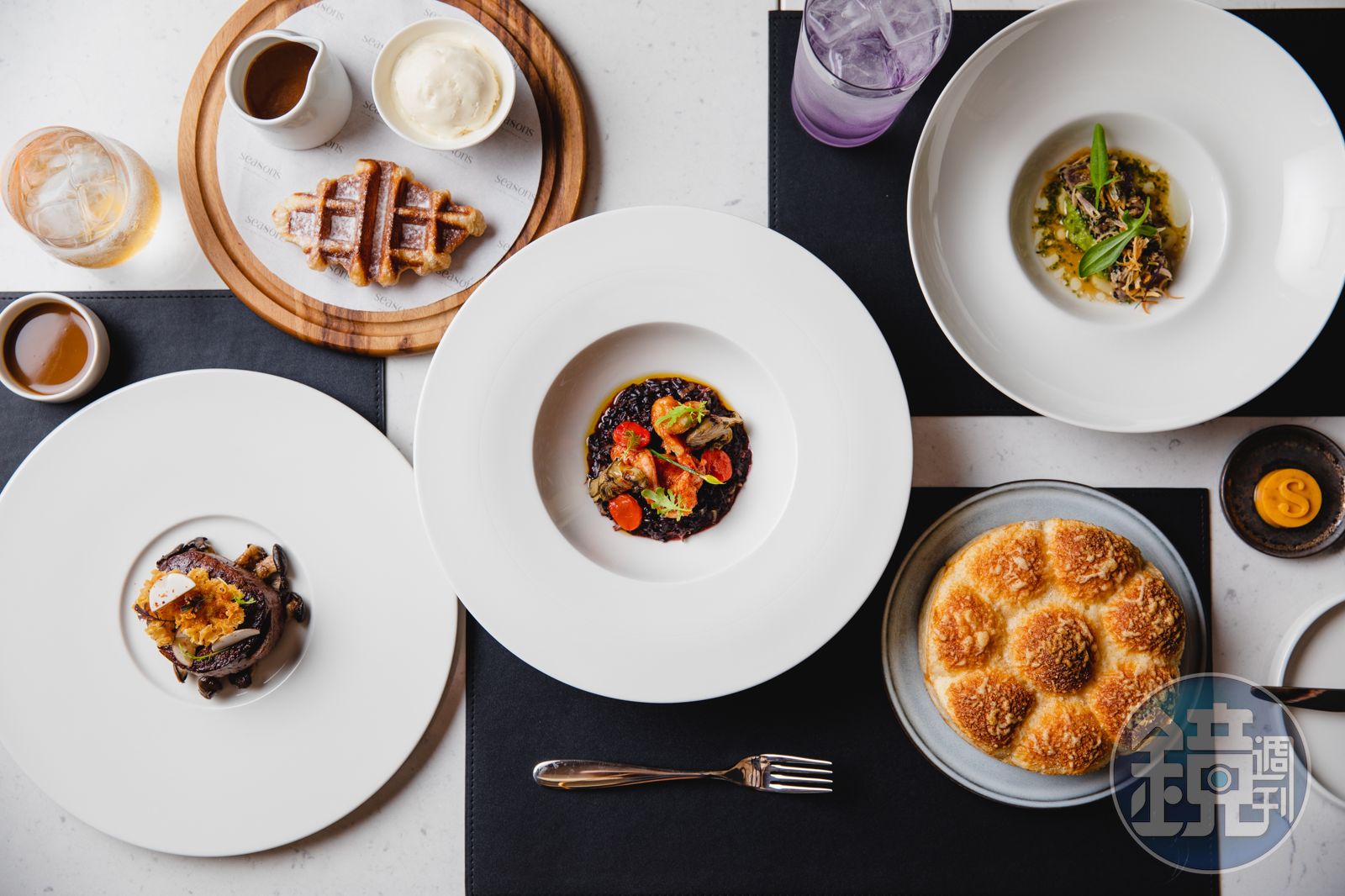 Seasons by olivier e.開幕首季菜單即可品嘗主廚Olivier Elzer的多道招牌菜式,餐廳消費模式除了單點菜色以外,無菜單料理也是亮點之一。分別有4道菜1,988元起、6道菜2,588元起、8道菜2,988元起的選擇,以單人每位計價,10%服務費另計。