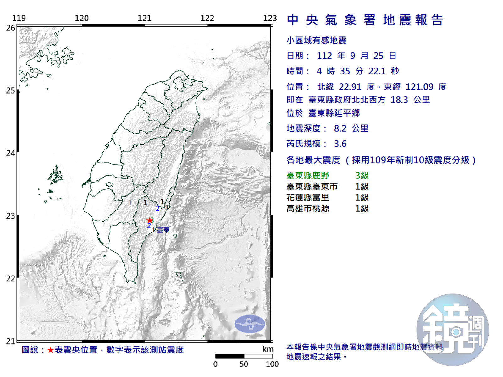 中央氣象署資料顯示,今(25日)4時35分發生小區域有感地震,於北緯22.91度、東經121.09度,即台東縣政府北北西方18.3公里 ,位於台東縣延平鄉,地震深度8.2公里、芮氏規模3.6;台東最大震度3級、花蓮與高雄最大震度1級。然而,氣象署災防告警系統(PWS)也對台南發布災防告警訊息。