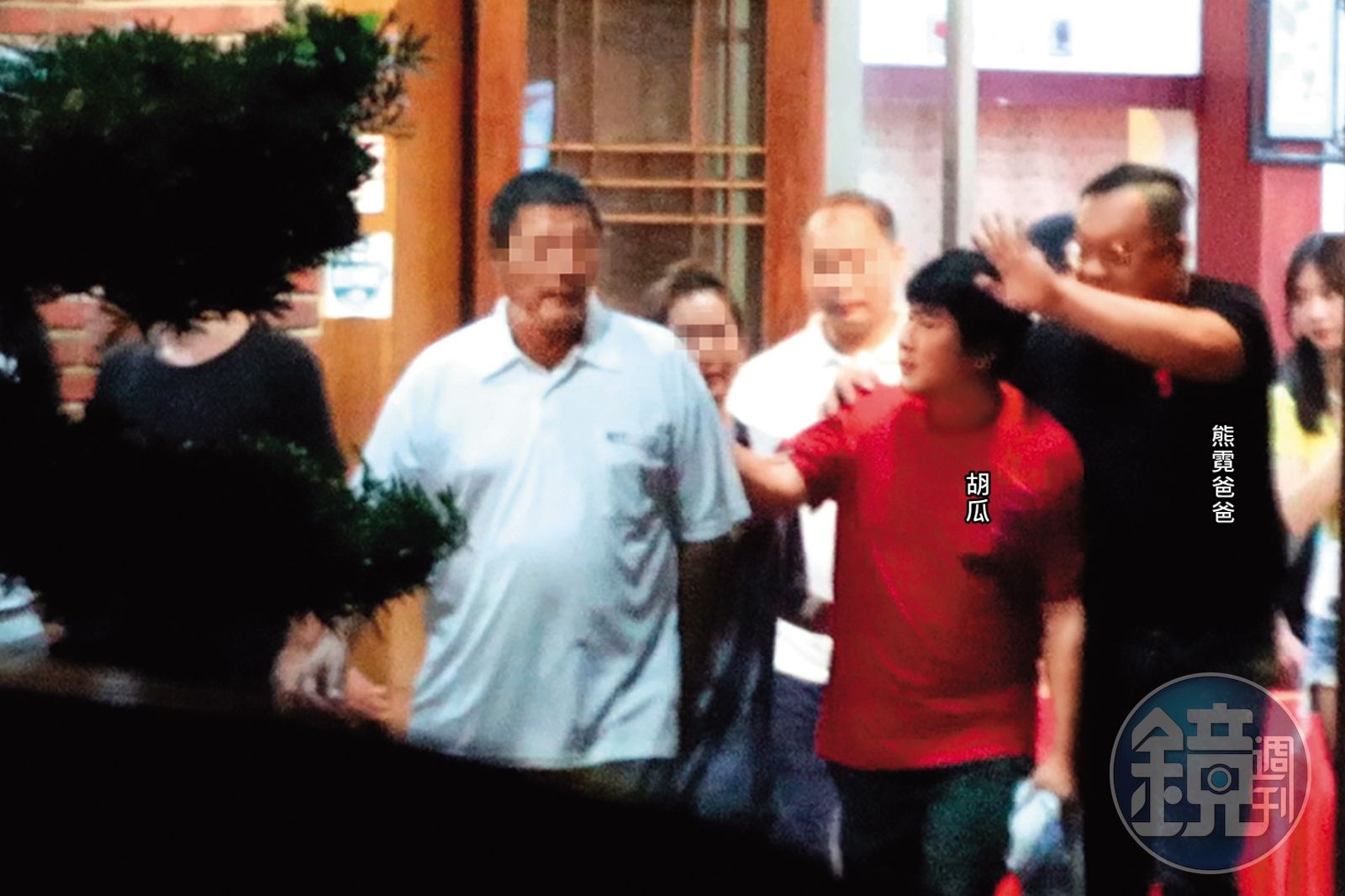 剛好近來盛傳胡瓜對熊霓照顧有加之後,這幅畫面更顯意味深長。(翻攝自熊哲良臉書)胡瓜(左)與熊霓的爸爸(右)貼臉合照,可見得熊爸也是擅長交遊而且很會拉近人際距離。(翻攝自熊哲良臉書)當天下午將近5點多,熊霓和嘎琳工作結束走了出來,爸媽幫忙把行李放進黑色賓利的後車廂後再上車;事後胡瓜的愛車白色橘頂軟蓬勞斯萊斯也跟上,一起前往新竹縣竹東鎮大林路的一間熱門餐廳,介紹寫著「精緻美食,豐富的菜色,優雅的用餐環境」,可見接待頗為盛大禮遇。