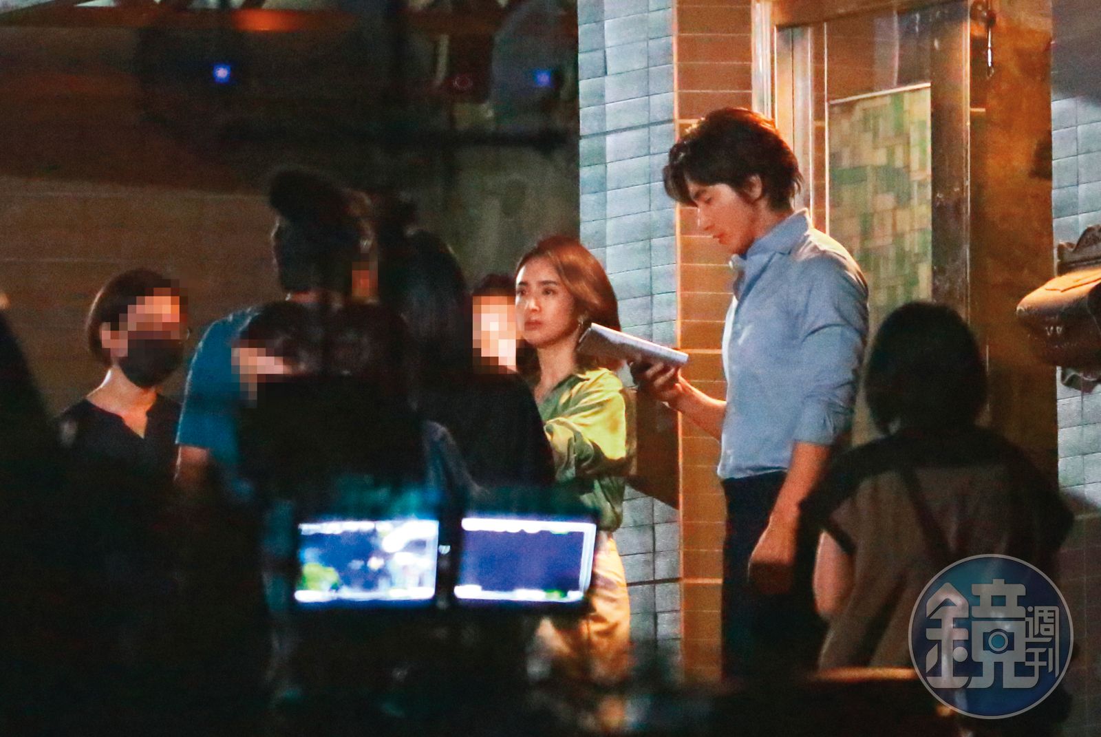 9/25 00:05 林依晨(左)跟言承旭(右)自前門現身,器材已架設好,兩人開始走位排戲。發布時間:2023.09.27 05:58 臺北時間