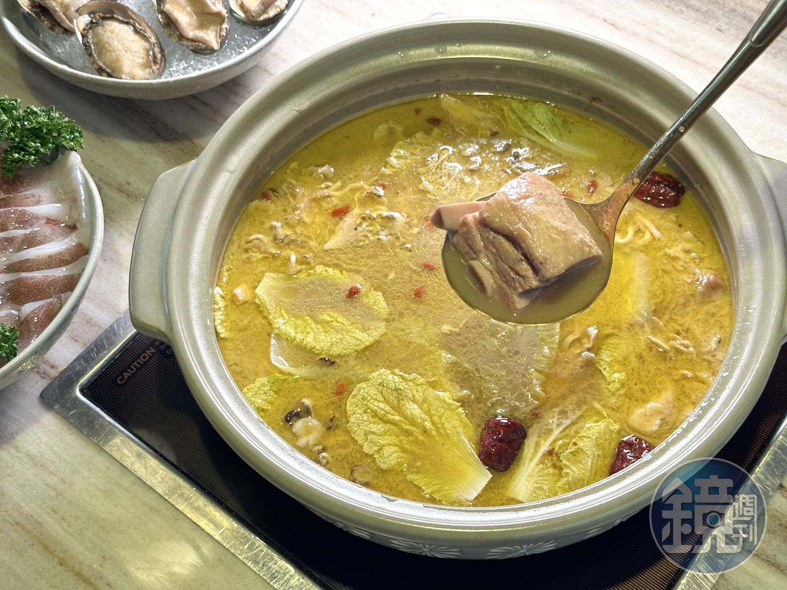 桌上滾得熱鬧沸騰的,是許益豪為了新開二店,研發的全新湯底「胡椒肉骨茶肋排雞湯鍋」。他以花膠雞湯為底,另外加進2種胡椒和12款中藥材,熬煮8小時而成,再搭配慢蒸2小時的溫體豬肋排。湯頭喝起來有胡椒香但不嗆辣,依然有雞湯的底蘊,但清爽許多,涮了鍋料、肉片,也不覺得死鹹,是很耐吃的湯底。肋排不要煮太久,才能嘗到甜嫩的口感。