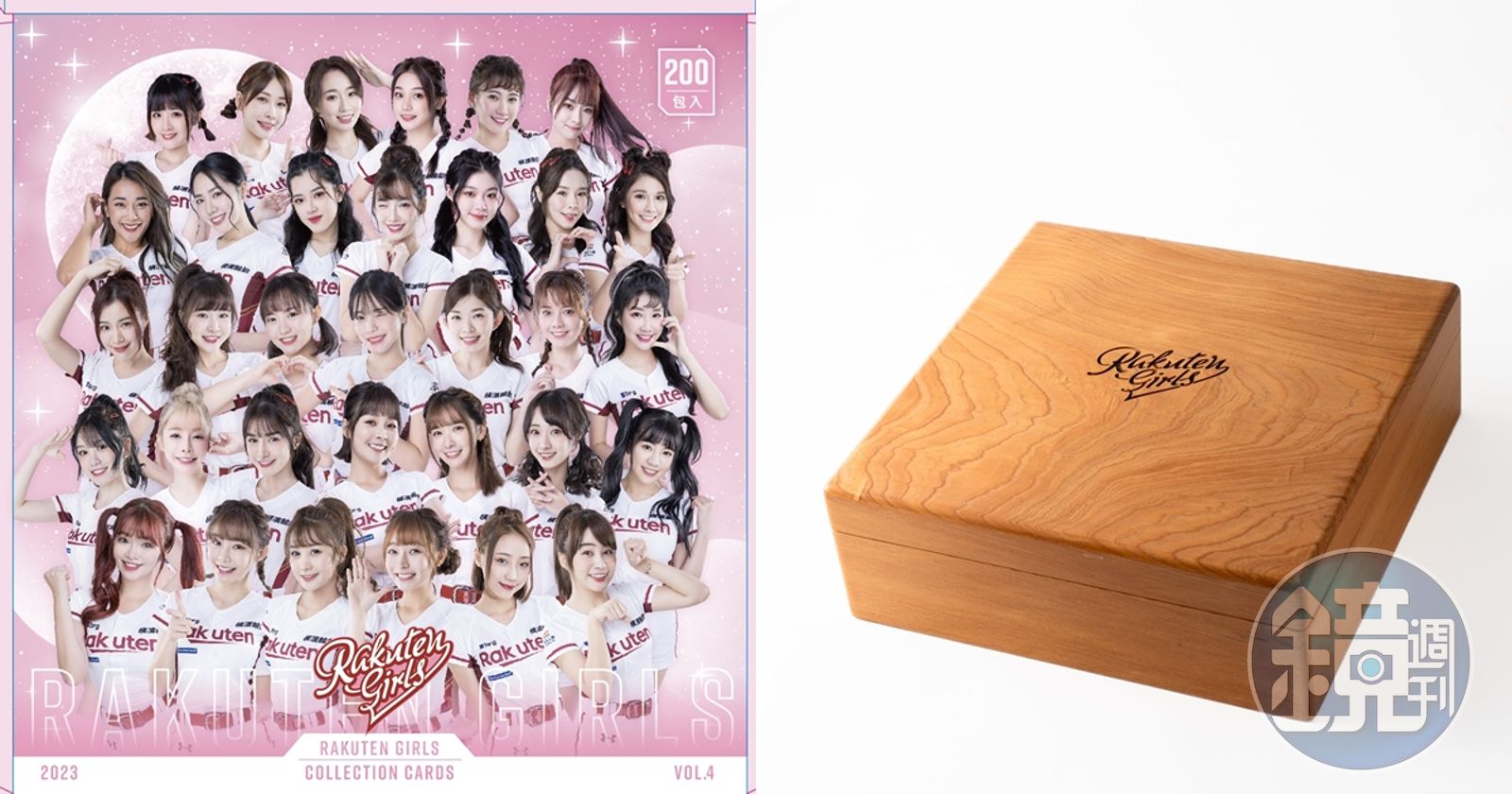 2023樂天女孩卡第4代上市,包含普卡、限量卡、制服簽名卡、唇印卡等各式卡片,還有真髮封入的「髮香卡」,並分成3種等級,包含限量200盒的玩家盒,每盒售價1萬8,000元,每盒200包,每包5張;限量200盒的精裝盒,每盒售價1萬8,800元,每盒20包,每包5張,含至少25張的稀有卡及限量卡或簽名卡;以及共26盒的頂級收藏家台灣檜木盒,每盒8萬8,000元,內含1 of 1獨一無二簽名卡20張以上,24位女孩加Rina及壯壯的2022辣酷甜趴實戰簽名球衣1件,隨機封入。