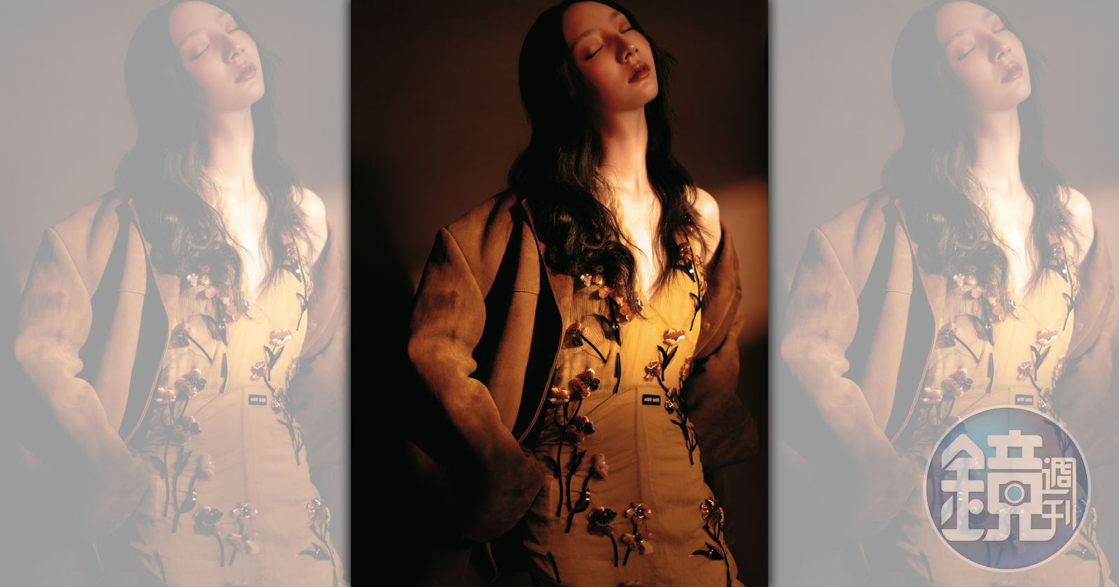 就像芥末醬與牛排的協調搭配,花朵刺繡宛如芥末子般地星點散布,更成為連結帶有粗糙肉質地的麂皮外套的橋梁。