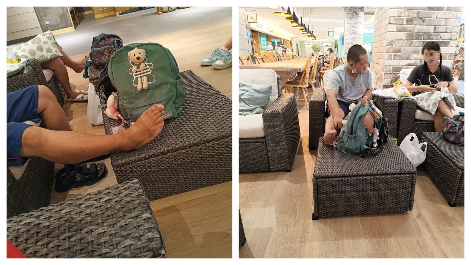 該網友貼出當下的照片,只見平頭灰衣男右腳脫了涼鞋赤腳跨在置物桌上,而左腳則光盤坐在布面沙發上,即使樓管來勸導,但情侶則不以為然反嗆「休息區不就是讓客人放鬆休息?不能翹腳?不能跨腳?你們什麼口氣?!」「你們可以不要看,看了不舒服是你的事,你們可以不要坐在這裡。」