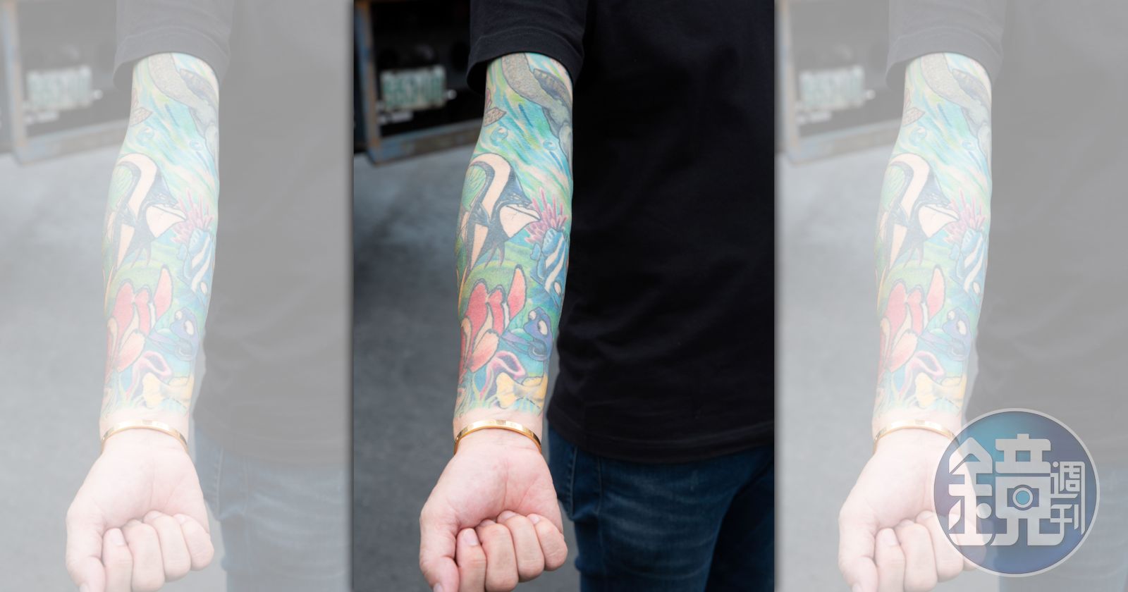 鵝房宮老闆張志民的右手滿是刺青,那可不是當古惑仔時紋的,而是40歲時,看到網美部落客百勒絲和她朋友一身刺青很漂亮,才決定刺青。(張志民提供)張志民笑著說:「年輕叛逆沒刺青,因為不敢、怕媽媽知道我混黑社會、看到難過。40歲我在一點利黃昏市場經營鵝房宮時,那時候創始店慢慢成為市場隱藏版美食,吸引來了一位網美部落客百勒絲來吃,她跟她朋友的一身刺青好漂亮,我骨子裡的劣根性好像突然被喚醒,當下就決定要紋身。」他伸出手臂、我們定睛一看,竟噗哧笑了出來,原來這位餐飲大亨刺的圖案是卡通「海底總動員」,滿可愛的,一點也沒有刺龍刺鳳、凶神惡煞的氣息。