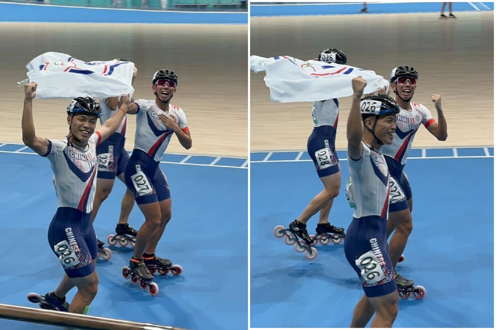 今日滑輪競速溜冰男子3000公尺接力決賽中,南韓隊幾乎是一路領先,因此到了最後一圈、擔任南韓隊最後一棒的鄭喆元,以為勝券在握,人還沒到終點線,就先雙手舉起來嗨爆,以為南韓隊就要奪金。但當大會最後公布總成績時,竟然發現拿下金牌的是中華隊,兩隊僅以0.01秒之差,最後南韓只能拿銀牌。